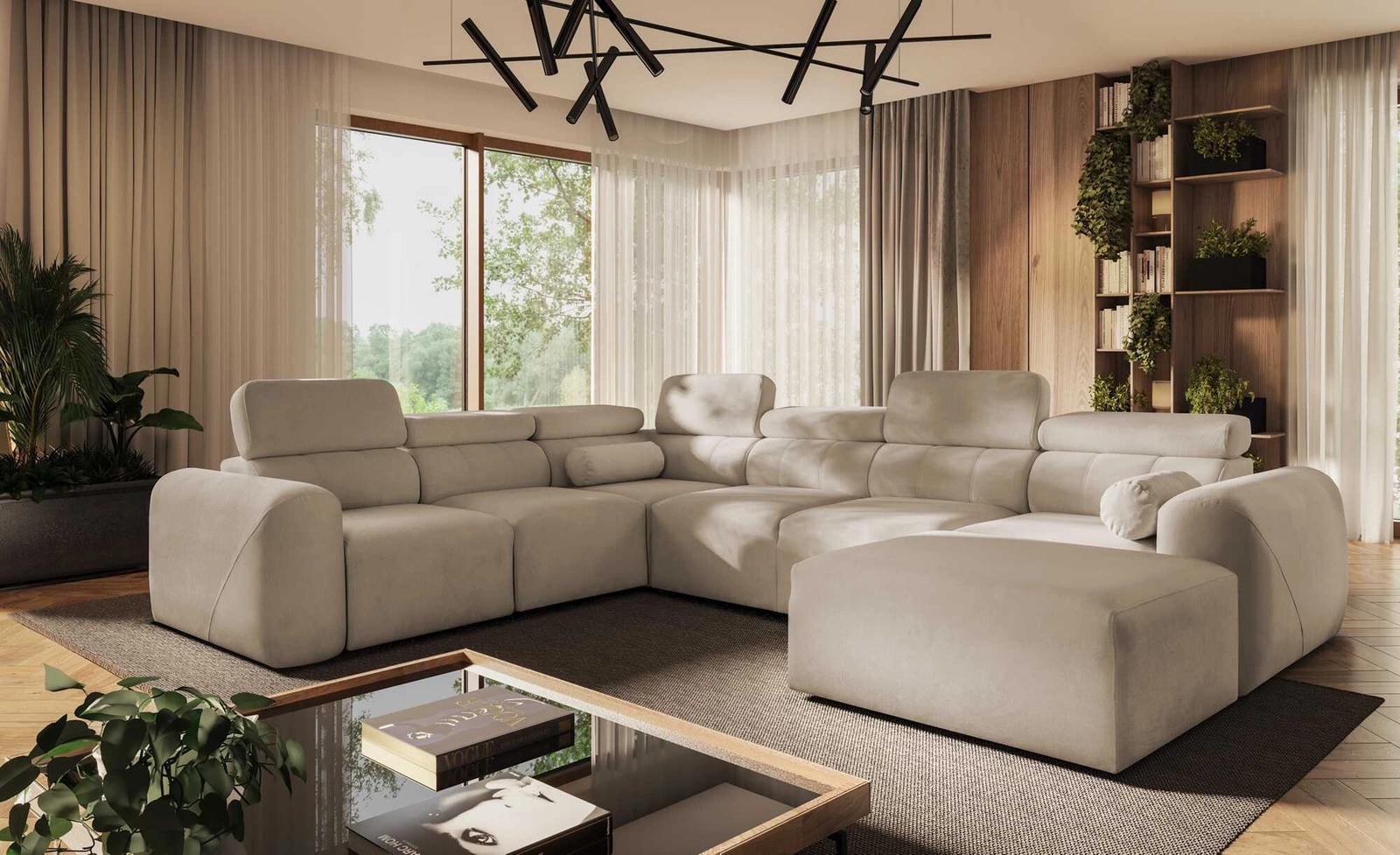 Narożnik z funkcją spania Cantare VIII beżowy prawostronny gustowny narożnik z regulowanymi zagłówkami pojemniki na pościel