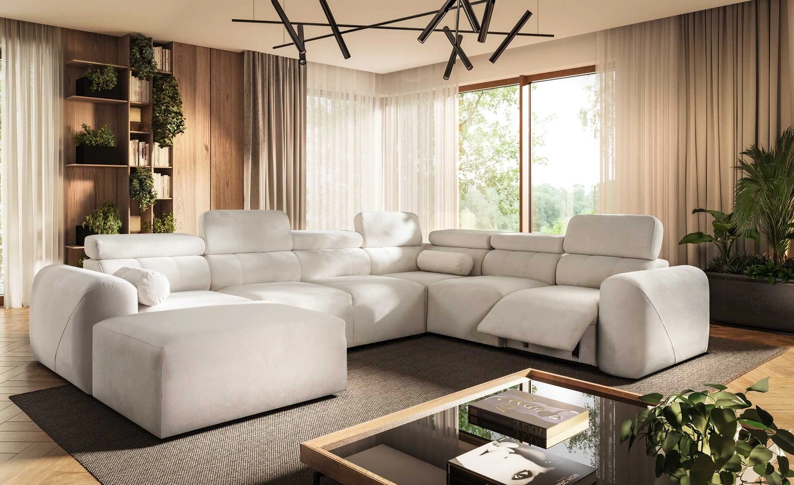 Narożnik z funkcją spania Cantare VIII Lux kość słoniowa lewostronny designerski narożnik z elektrycznie podnoszonym podnóżkiem