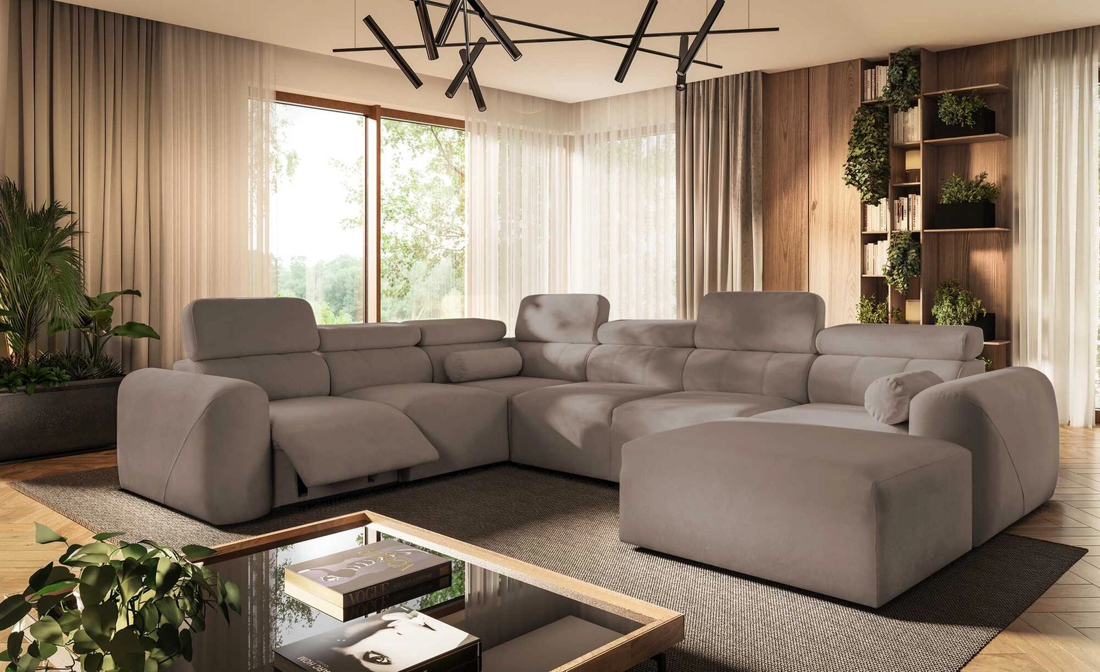 Narożnik z funkcją spania Cantare VIII Lux ciemny beż prawostronny designerski narożnik z elektrycznie podnoszonym podnóżkiem