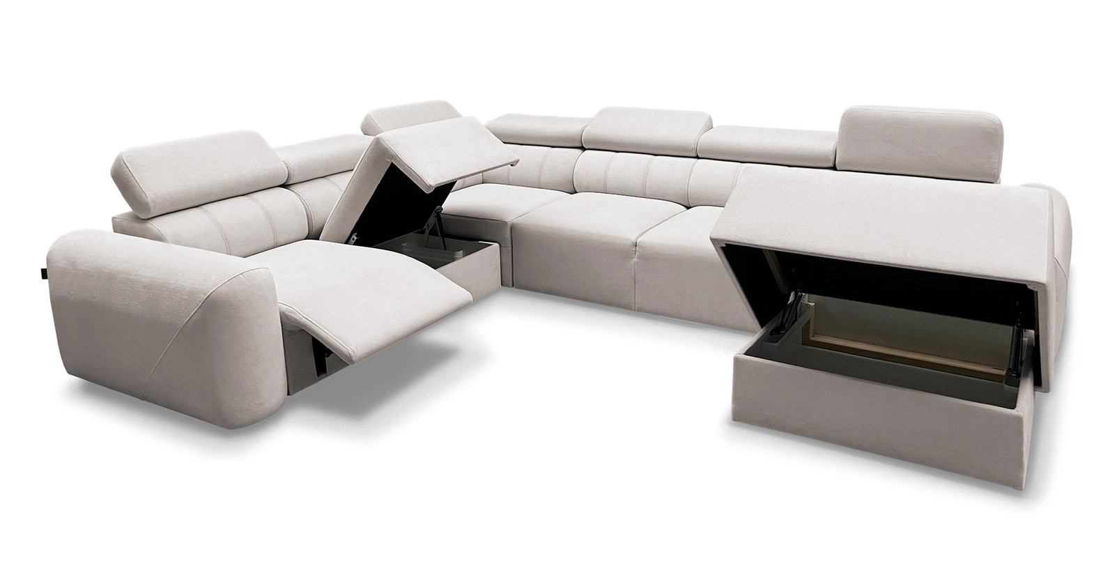 Dodatki tego mebla, które docenią wszyscy użytkownicy to elektrycznie podnoszony podnóżek, regulowane zagłówki, funkcja spania oraz pojemniki na pościel.