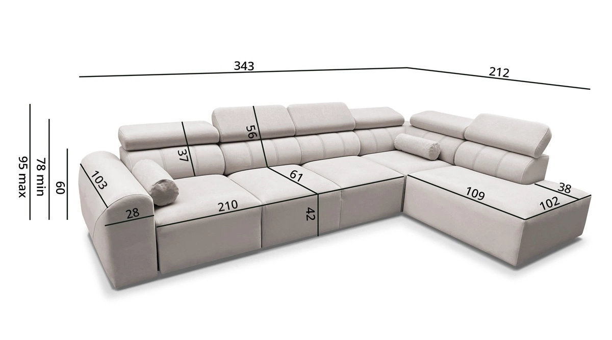 Wymiary mebla pozwolą na zapełnienie przestrzeni w przestronnym salonie lub pokoju dziennym. Szerokość narożnika 343 cm, wysokość maksymalna 95 cm oraz głębokość 212 cm. Powierzchnia spania narożnika wynosi 132x202 cm. Wysokość siedziska mebla to 42 cm a maksymalna wysokość oparcia wynosi 56 cm. Sprężyny faliste oraz pianka poliuretanowa T30 to materiał, z którego wykonane zostało siedzisko narożnika. Oparcie z regulowanymi zagłówkami pozwoli na łatwe dostosowanie kąta nachylenia zagłówków do swoich preferencji oraz daje gwarancję wygodnego wypoczynku po długim dniu, które docenisz Ty, Twoi bliscy a także goście, którzy zasiądą na tym wyjątkowym narożniku.