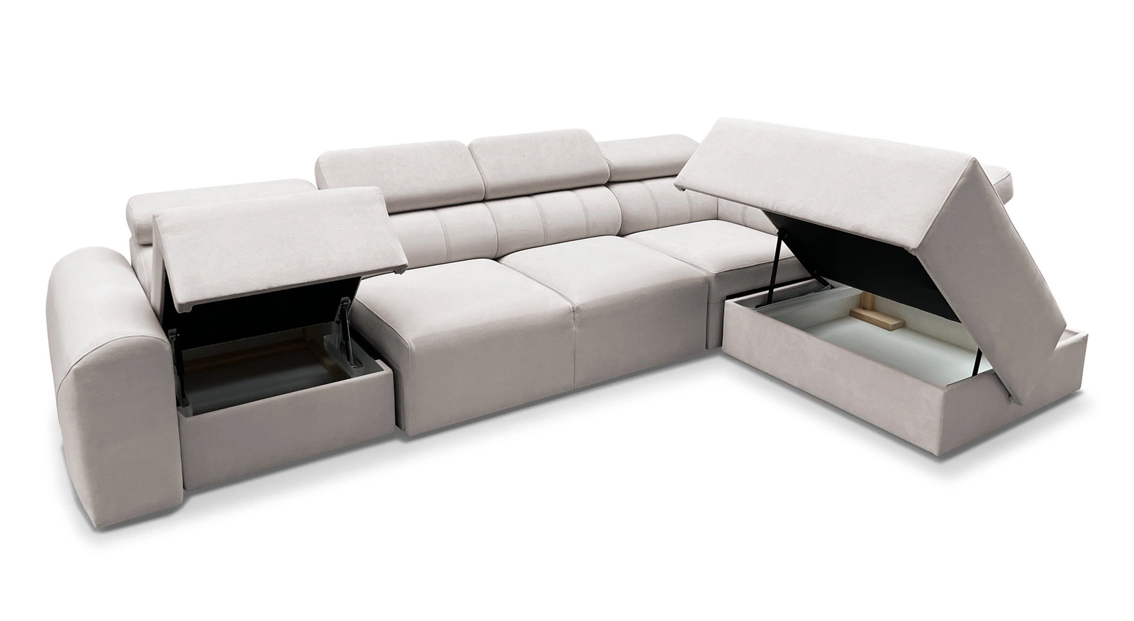Dodatki tego mebla, które docenią wszyscy użytkownicy to regulowane zagłówki, funkcja spania oraz pojemniki na pościel.