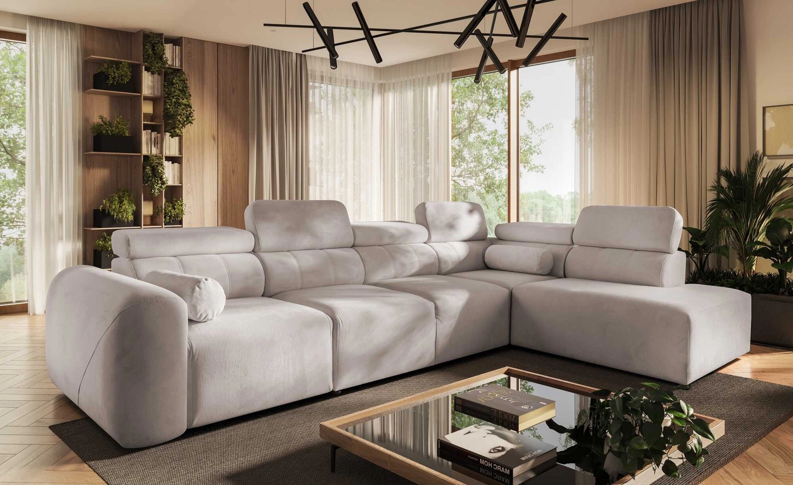 - Narożnik Cantare XI cechuje się nowoczesnym i eleganckim designem. Narożnik w całości został wykonany z pluszowej tkaniny o delikatnej fakturze, która dodaje wnętrzu przytulności i subtelnego charakteru. Pojemniki na pościel to kolejny atut bryły.