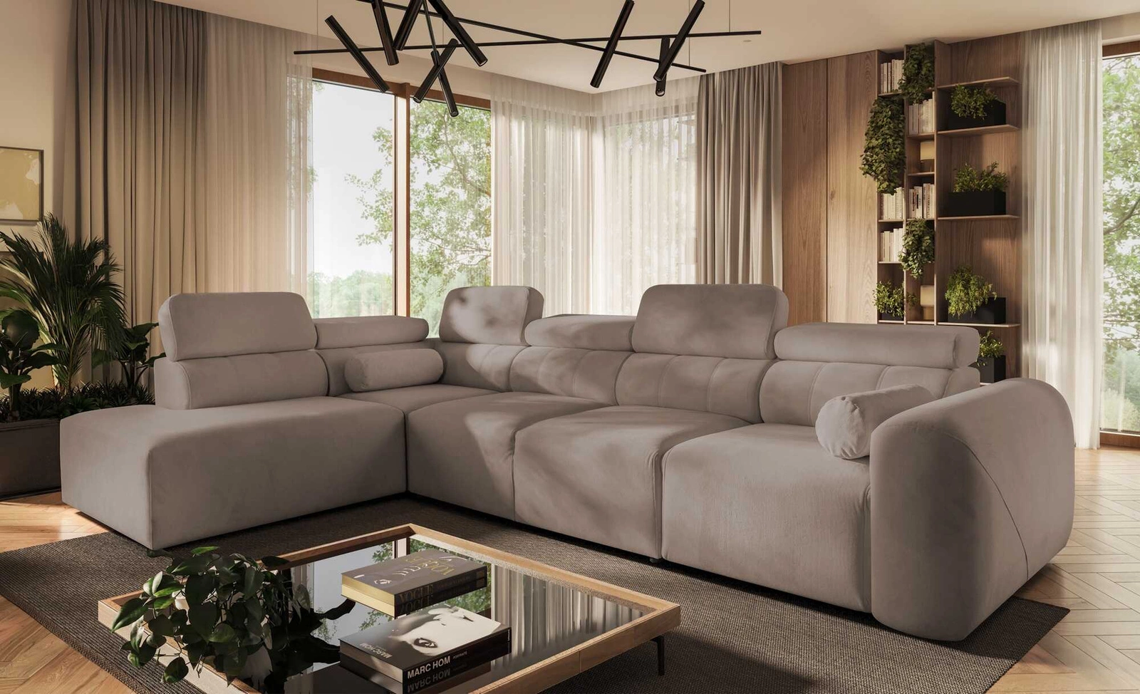 Narożnik z funkcją spania Cantare XI ciemny beż lewostronny funkcjonalny i komfortowy narożnik o nowoczesnym designie pluszowa tkanina
