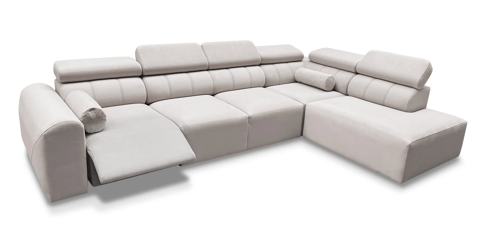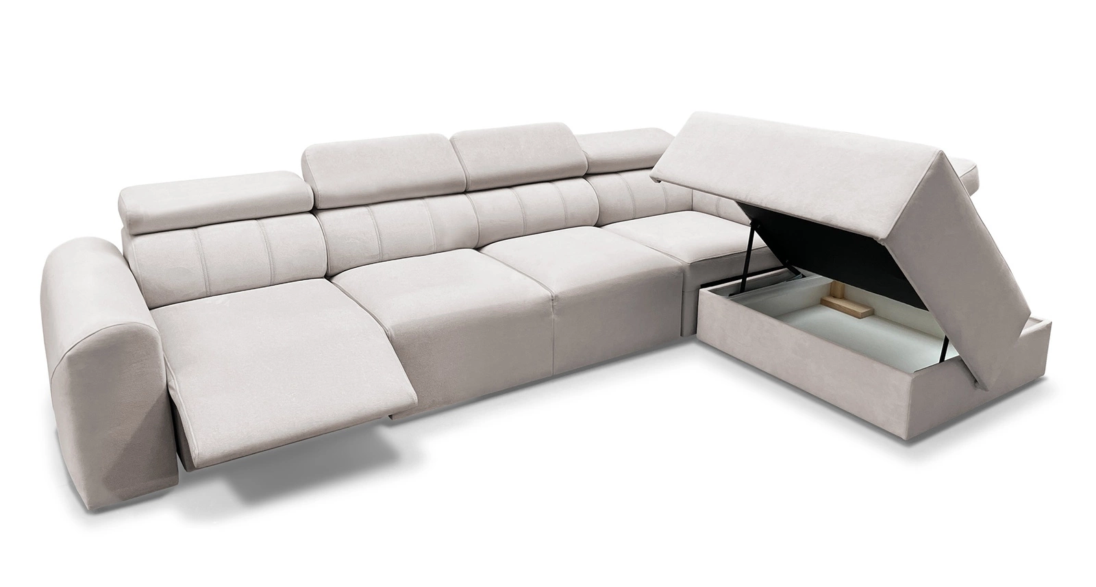 Dodatki tego mebla, które docenią wszyscy użytkownicy to elektrycznie podnoszony podnóżek, regulowane zagłówki, funkcja spania oraz pojemnik na pościel.