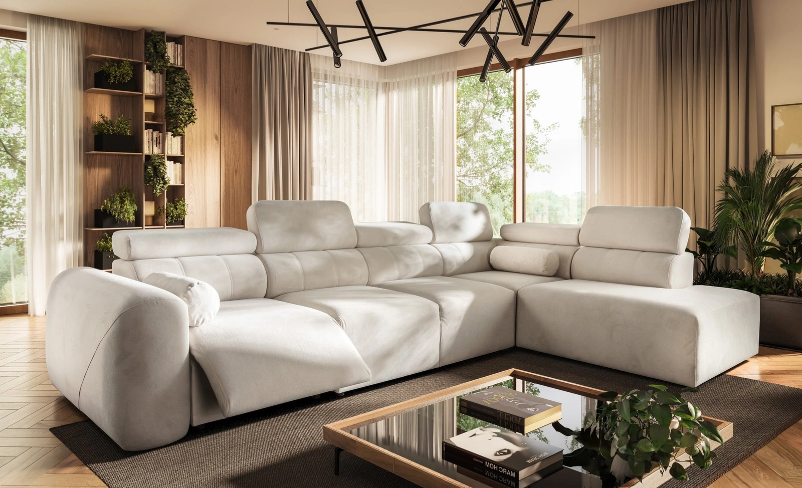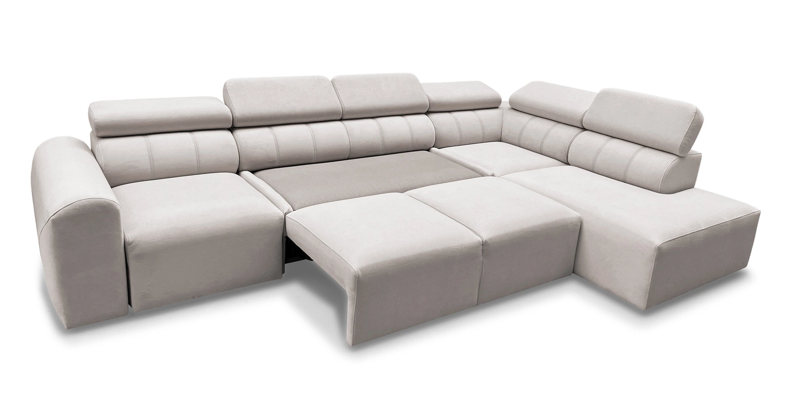 Narożnik z funkcją spania Cantare XI Lux kość słoniowa prawostronny komfortowy narożnik do salonu z podnoszonym podnóżkiem miękka tkanina