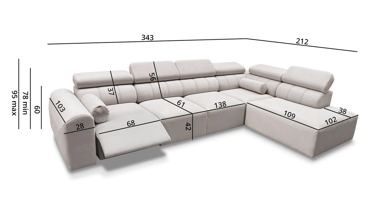 Wymiary mebla pozwolą na zapełnienie przestrzeni w przestronnym salonie lub pokoju dziennym. Szerokość narożnika 343 cm, wysokość maksymalna 95 cm oraz głębokość 212 cm. Powierzchnia spania narożnika wynosi 132x202 cm. Wysokość siedziska mebla to 42 cm a maksymalna wysokość oparcia wynosi 56 cm. Sprężyny faliste oraz pianka poliuretanowa T30 to materiał, z którego wykonane zostało siedzisko narożnika. Oparcie z regulowanymi zagłówkami pozwoli na łatwe dostosowanie kąta nachylenia zagłówków do swoich preferencji oraz daje gwarancję wygodnego wypoczynku po długim dniu, które docenisz Ty, Twoi bliscy a także goście, którzy zasiądą na tym wyjątkowym narożniku.
