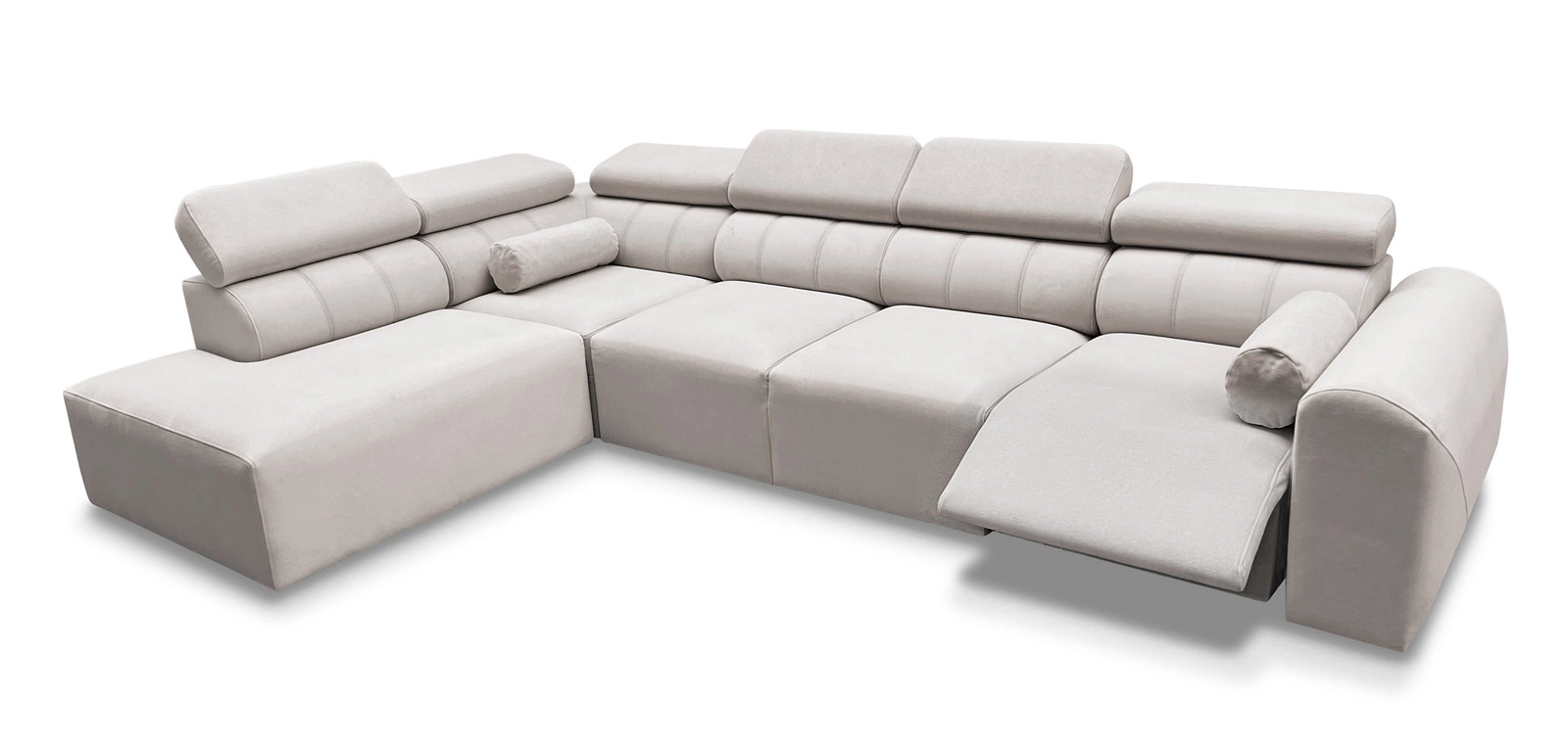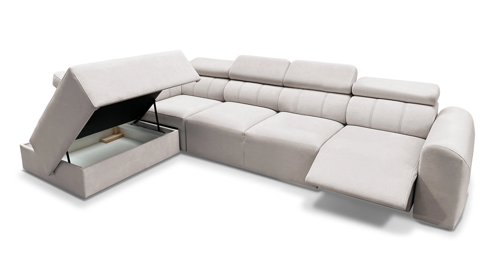 Dodatki tego mebla, które docenią wszyscy użytkownicy to elektrycznie podnoszony podnóżek, regulowane zagłówki, funkcja spania oraz pojemnik na pościel.