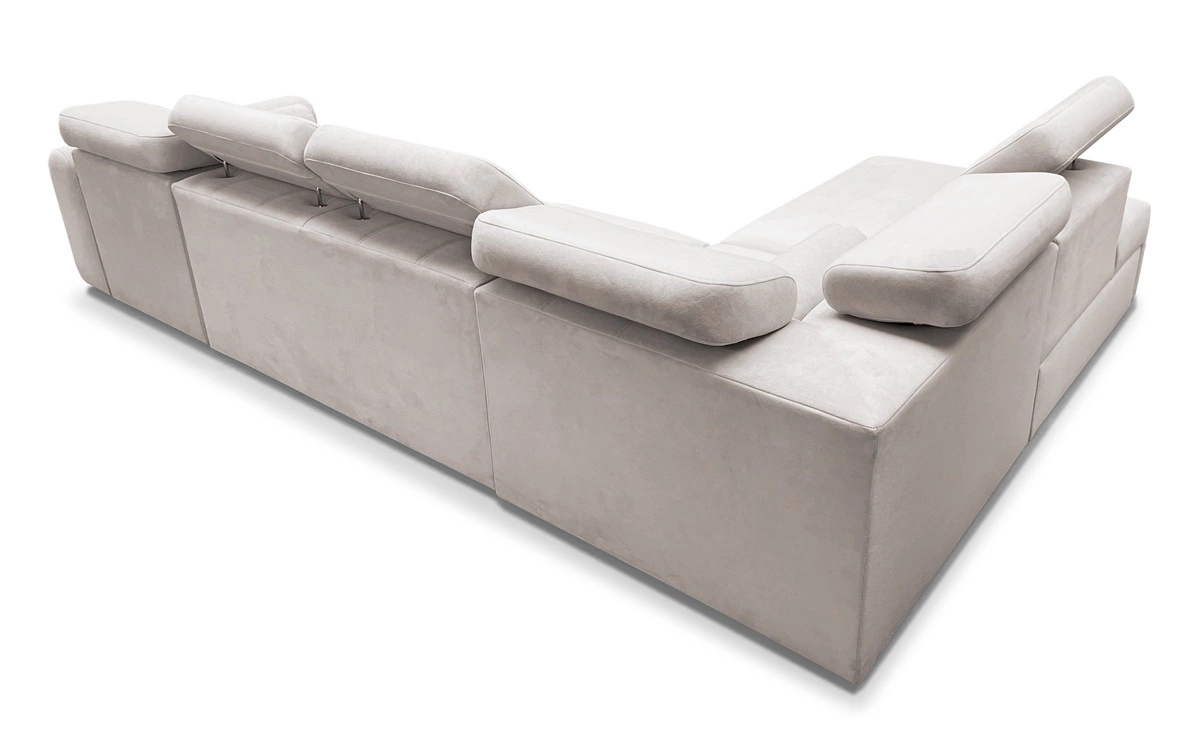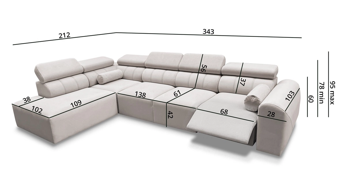 Wymiary mebla pozwolą na zapełnienie przestrzeni w przestronnym salonie lub pokoju dziennym. Szerokość narożnika 343 cm, wysokość maksymalna 95 cm oraz głębokość 212 cm. Powierzchnia spania narożnika wynosi 132x202 cm. Wysokość siedziska mebla to 42 cm a maksymalna wysokość oparcia wynosi 56 cm. Sprężyny faliste oraz pianka poliuretanowa T30 to materiał, z którego wykonane zostało siedzisko narożnika. Oparcie z regulowanymi zagłówkami pozwoli na łatwe dostosowanie kąta nachylenia zagłówków do swoich preferencji oraz daje gwarancję wygodnego wypoczynku po długim dniu, które docenisz Ty, Twoi bliscy a także goście, którzy zasiądą na tym wyjątkowym narożniku.