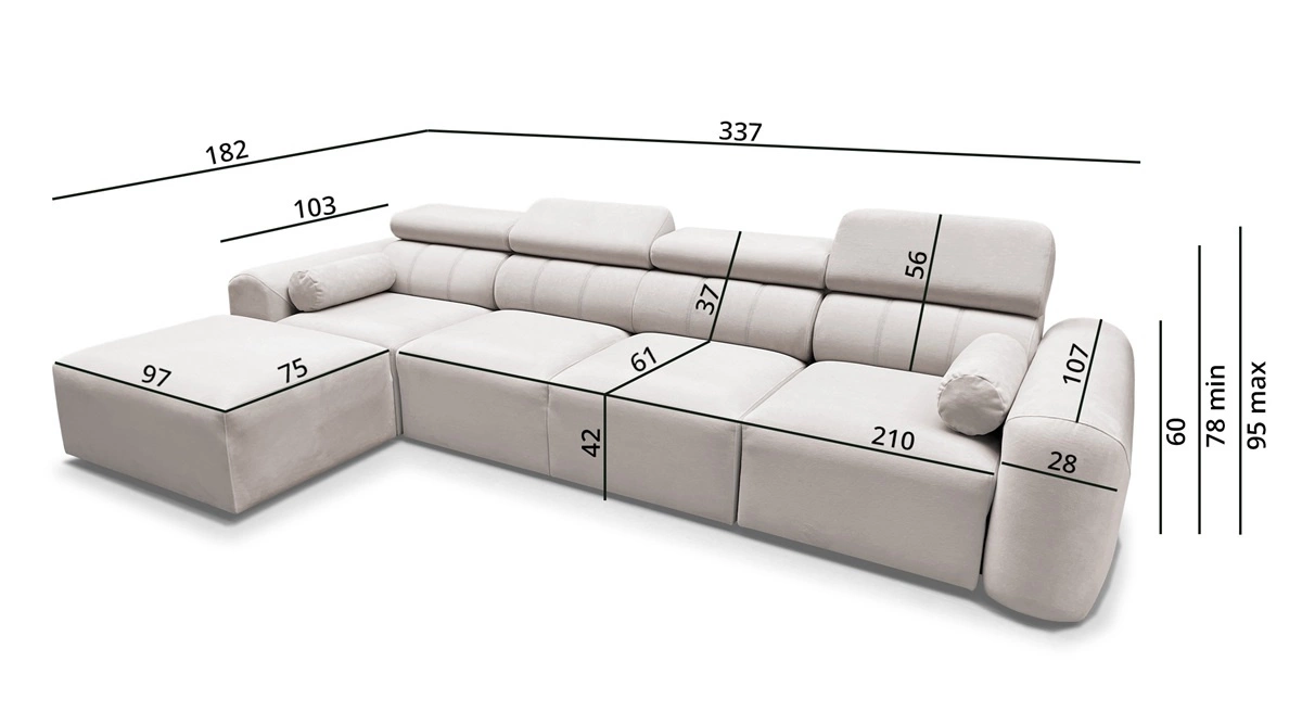 Wymiary mebla pozwolą na zapełnienie przestrzeni w przestronnym salonie lub pokoju dziennym. Szerokość narożnika 337 cm, wysokość maksymalna 95 cm oraz głębokość 182 cm. Powierzchnia spania narożnika wynosi 132x207 cm. Wysokość siedziska mebla to 42 cm a maksymalna wysokość oparcia wynosi 56 cm. Sprężyny faliste oraz pianka poliuretanowa T30 to materiał, z którego wykonane zostało siedzisko narożnika. Oparcie z regulowanymi zagłówkami pozwoli na łatwe dostosowanie kąta nachylenia zagłówków do swoich preferencji oraz daje gwarancję wygodnego wypoczynku po długim dniu, które docenisz Ty, Twoi bliscy a także goście, którzy zasiądą na tym wyjątkowym narożniku.