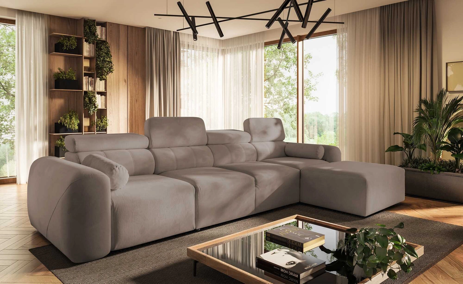 Narożnik z funkcją spania Cantare XII ciemny beż prawostronny estetyczny i niezwykle komfortowy narożnik z pojemnikiem na pościel