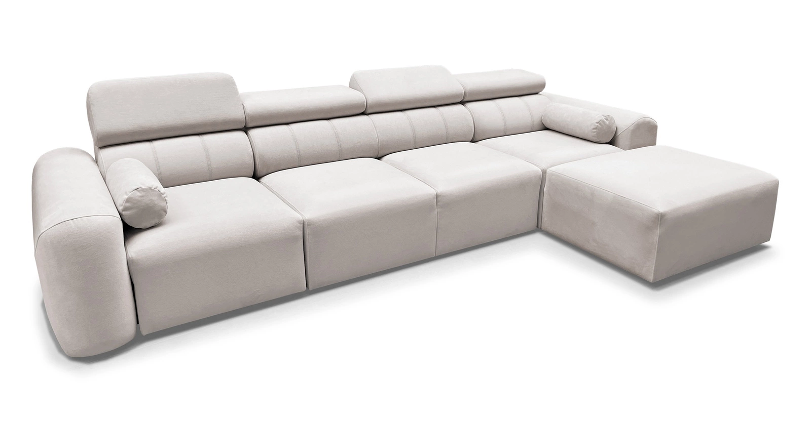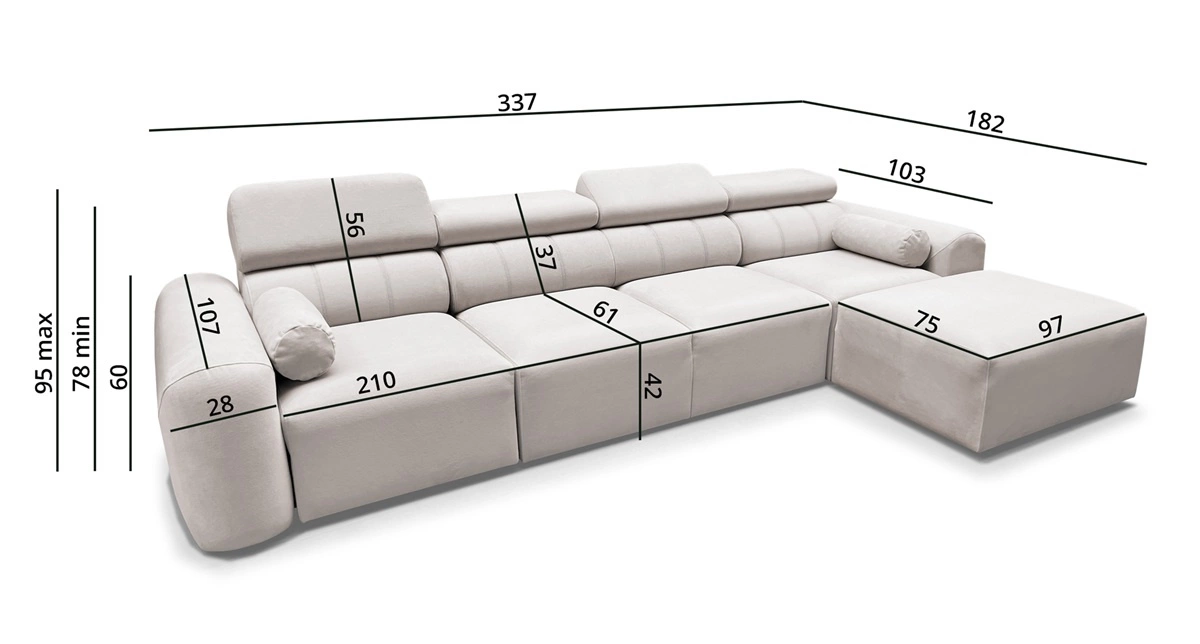 Wymiary mebla pozwolą na zapełnienie przestrzeni w przestronnym salonie lub pokoju dziennym. Szerokość narożnika 337 cm, wysokość maksymalna 95 cm oraz głębokość 182 cm. Powierzchnia spania narożnika wynosi 132x207 cm. Wysokość siedziska mebla to 42 cm a maksymalna wysokość oparcia wynosi 56 cm. Sprężyny faliste oraz pianka poliuretanowa T30 to materiał, z którego wykonane zostało siedzisko narożnika. Oparcie z regulowanymi zagłówkami pozwoli na łatwe dostosowanie kąta nachylenia zagłówków do swoich preferencji oraz daje gwarancję wygodnego wypoczynku po długim dniu, które docenisz Ty, Twoi bliscy a także goście, którzy zasiądą na tym wyjątkowym narożniku.
