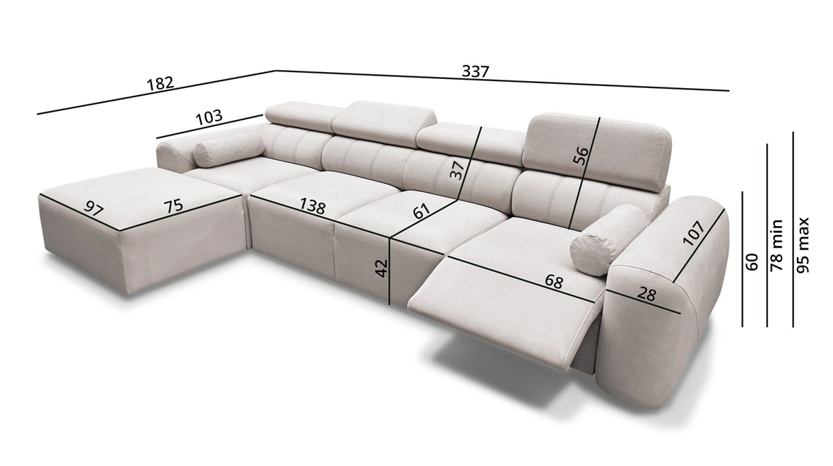 Wymiary mebla pozwolą na zapełnienie przestrzeni w przestronnym salonie lub pokoju dziennym. Szerokość narożnika 337 cm, wysokość maksymalna 95 cm oraz głębokość 182 cm. Powierzchnia spania narożnika wynosi 132x207 cm. Wysokość siedziska mebla to 42 cm a maksymalna wysokość oparcia wynosi 56 cm. Sprężyny faliste oraz pianka poliuretanowa T30 to materiał, z którego wykonane zostało siedzisko narożnika. Oparcie z regulowanymi zagłówkami pozwoli na łatwe dostosowanie kąta nachylenia zagłówków do swoich preferencji oraz daje gwarancję wygodnego wypoczynku po długim dniu, które docenisz Ty, Twoi bliscy a także goście, którzy zasiądą na tym wyjątkowym narożniku.
