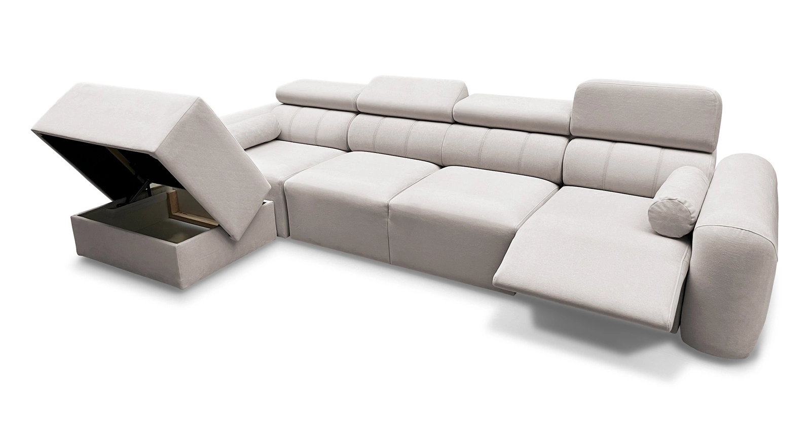 Dodatki tego mebla, które docenią wszyscy użytkownicy to elektrycznie podnoszony podnóżek, regulowane zagłówki, funkcja spania oraz pojemnik na pościel.