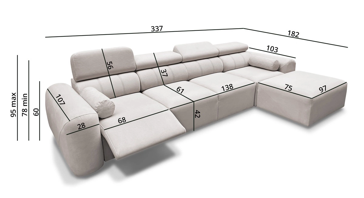 Wymiary mebla pozwolą na zapełnienie przestrzeni w przestronnym salonie lub pokoju dziennym. Szerokość narożnika 337 cm, wysokość maksymalna 95 cm oraz głębokość 182 cm. Powierzchnia spania narożnika wynosi 132x207 cm. Wysokość siedziska mebla to 42 cm a maksymalna wysokość oparcia wynosi 56 cm. Sprężyny faliste oraz pianka poliuretanowa T30 to materiał, z którego wykonane zostało siedzisko narożnika. Oparcie z regulowanymi zagłówkami pozwoli na łatwe dostosowanie kąta nachylenia zagłówków do swoich preferencji oraz daje gwarancję wygodnego wypoczynku po długim dniu, które docenisz Ty, Twoi bliscy a także goście, którzy zasiądą na tym wyjątkowym narożniku.