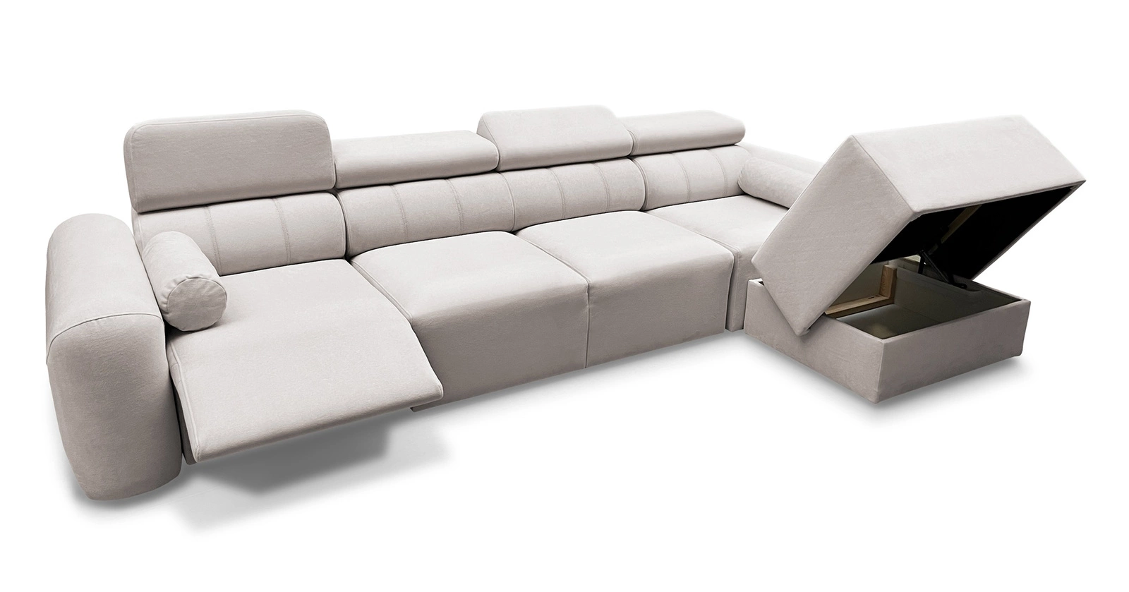 Dodatki tego mebla, które docenią wszyscy użytkownicy to elektrycznie podnoszony podnóżek, regulowane zagłówki, funkcja spania oraz pojemnik na pościel.