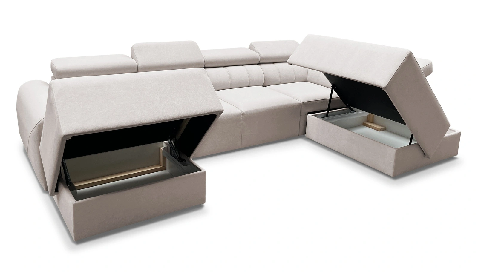 Dodatki tego mebla, które docenią wszyscy użytkownicy to regulowane zagłówki, funkcja spania oraz pojemniki na pościel.