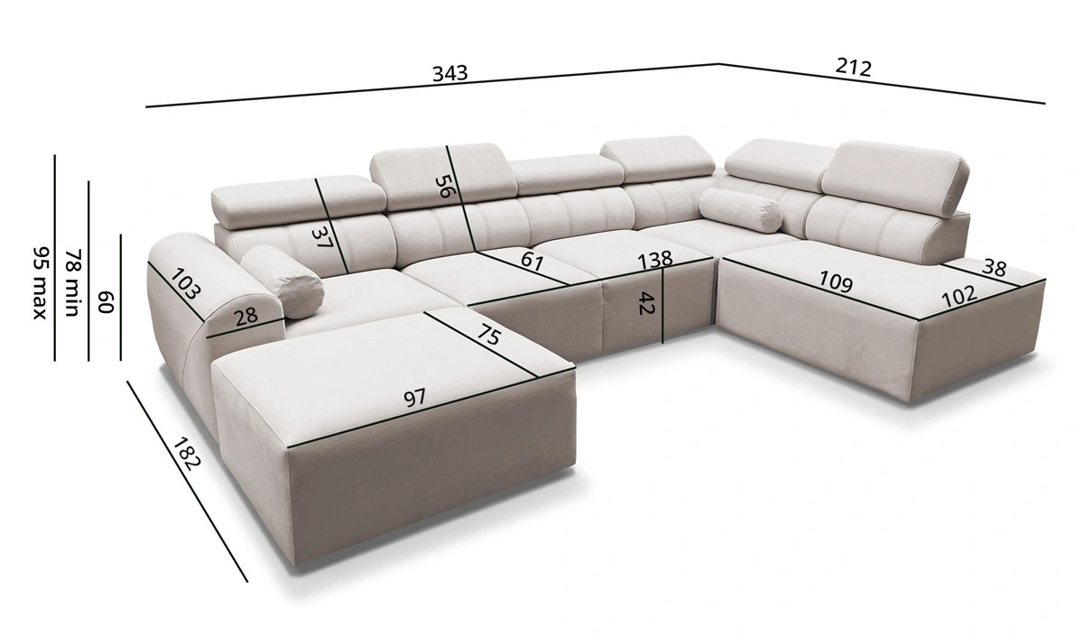 Wymiary mebla pozwolą na zapełnienie przestrzeni w przestronnym salonie lub pokoju dziennym. Szerokość narożnika 343 cm, wysokość maksymalna 95 cm oraz głębokość 212 cm. Powierzchnia spania narożnika wynosi 132x268 cm. Wysokość siedziska mebla to 42 cm a maksymalna wysokość oparcia wynosi 56 cm. Sprężyny faliste oraz pianka poliuretanowa T30 to materiał, z którego wykonane zostało siedzisko narożnika. Oparcie z regulowanymi zagłówkami pozwoli na łatwe dostosowanie kąta nachylenia zagłówków do swoich preferencji oraz daje gwarancję wygodnego wypoczynku po długim dniu, które docenisz Ty, Twoi bliscy a także goście, którzy zasiądą na tym wyjątkowym narożniku.