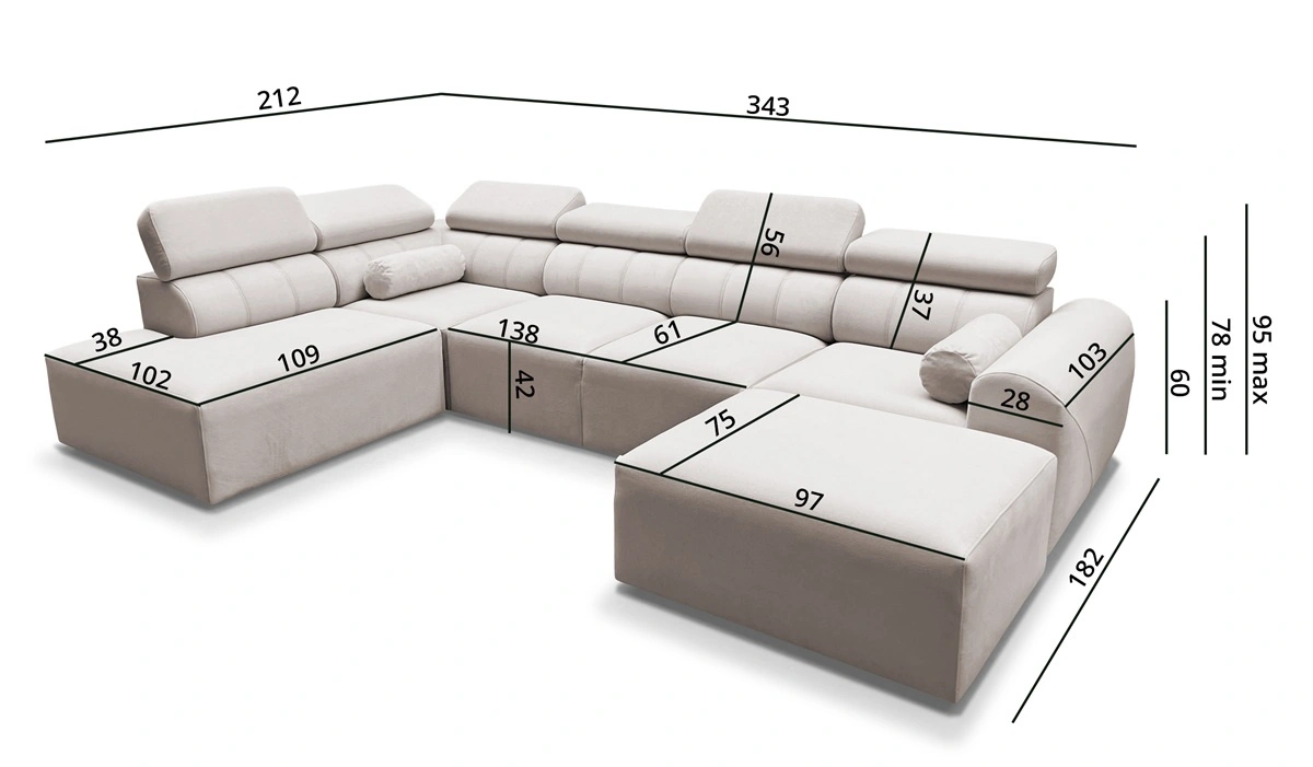 Wymiary mebla pozwolą na zapełnienie przestrzeni w przestronnym salonie lub pokoju dziennym. Szerokość narożnika 343 cm, wysokość maksymalna 95 cm oraz głębokość 212 cm. Powierzchnia spania narożnika wynosi 132x268 cm. Wysokość siedziska mebla to 42 cm a maksymalna wysokość oparcia wynosi 56 cm. Sprężyny faliste oraz pianka poliuretanowa T30 to materiał, z którego wykonane zostało siedzisko narożnika. Oparcie z regulowanymi zagłówkami pozwoli na łatwe dostosowanie kąta nachylenia zagłówków do swoich preferencji oraz daje gwarancję wygodnego wypoczynku po długim dniu, które docenisz Ty, Twoi bliscy a także goście, którzy zasiądą na tym wyjątkowym narożniku.