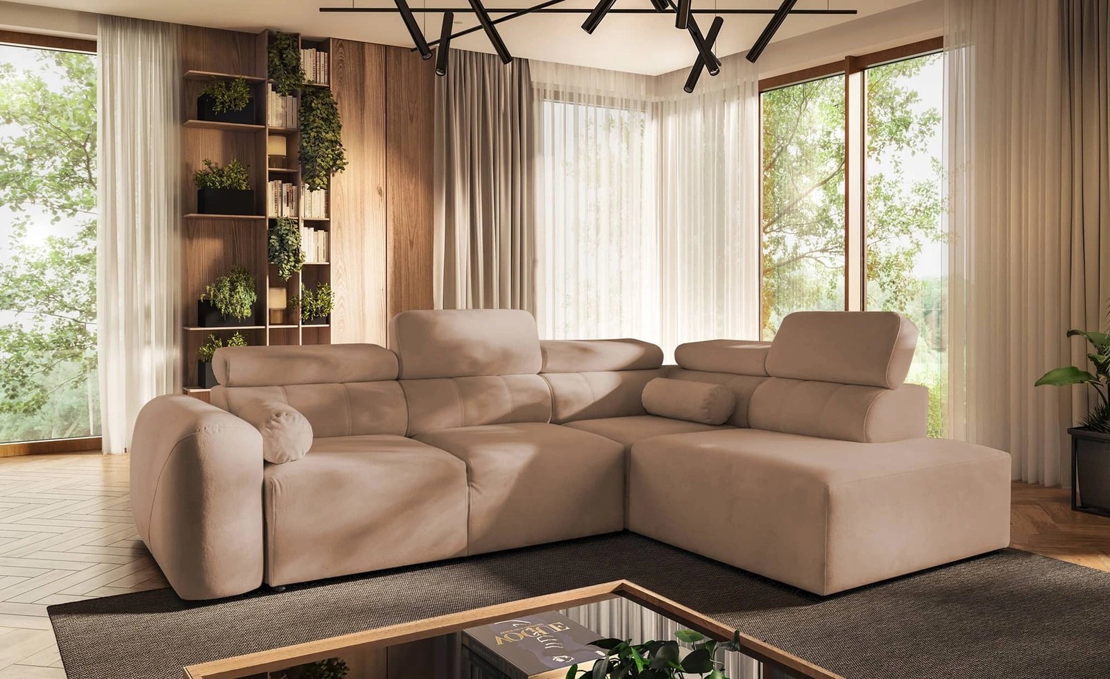 - Narożnik Cantare VII cechuje się nowoczesnym i eleganckim designem. Narożnik w całości został wykonany z pluszowej tkaniny o delikatnej fakturze, która dodaje wnętrzu przytulności i subtelnego charakteru. Pojemniki na pościel to kolejny atut bryły.