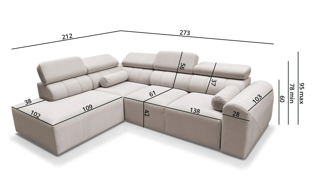 Wymiary mebla pozwolą na zapełnienie przestrzeni w przestronnym salonie lub pokoju dziennym. Szerokość narożnika 273 cm, wysokość maksymalna 95 cm oraz głębokość 212 cm. Powierzchnia spania narożnika wynosi 132x202 cm. Wysokość siedziska mebla to 42 cm a maksymalna wysokość oparcia wynosi 56 cm. Sprężyny faliste oraz pianka poliuretanowa T30 to materiał, z którego wykonane zostało siedzisko narożnika. Oparcie z regulowanymi zagłówkami pozwoli na łatwe dostosowanie kąta nachylenia zagłówków do swoich preferencji oraz daje gwarancję wygodnego wypoczynku po długim dniu, które docenisz Ty, Twoi bliscy a także goście, którzy zasiądą na tym wyjątkowym narożniku.