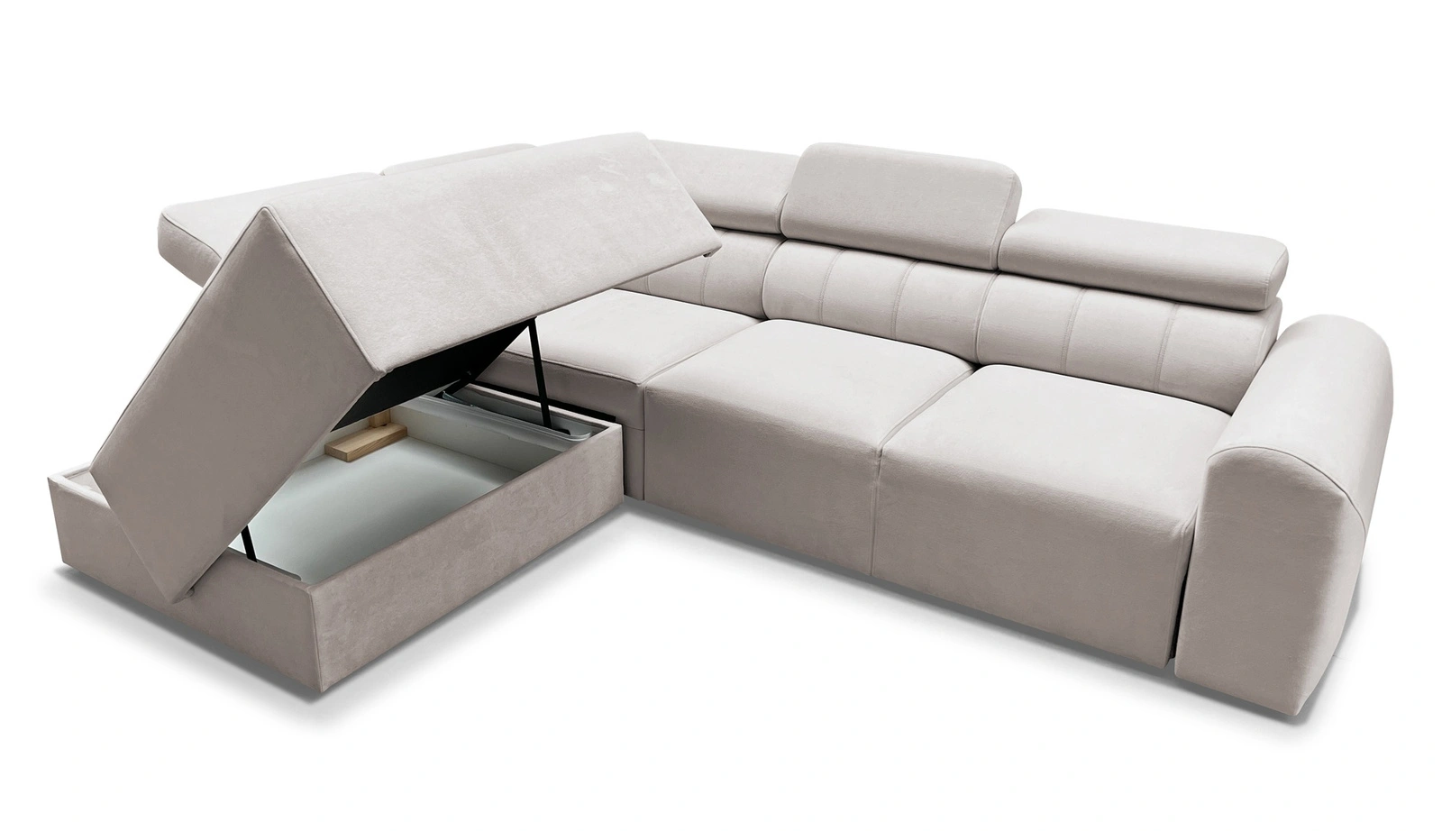 Narożnik z funkcją spania Cantare VII kremowy lewostronny narożnik z pojemnikiem na pościel wykonany z trwałej tkaniny typu plusz