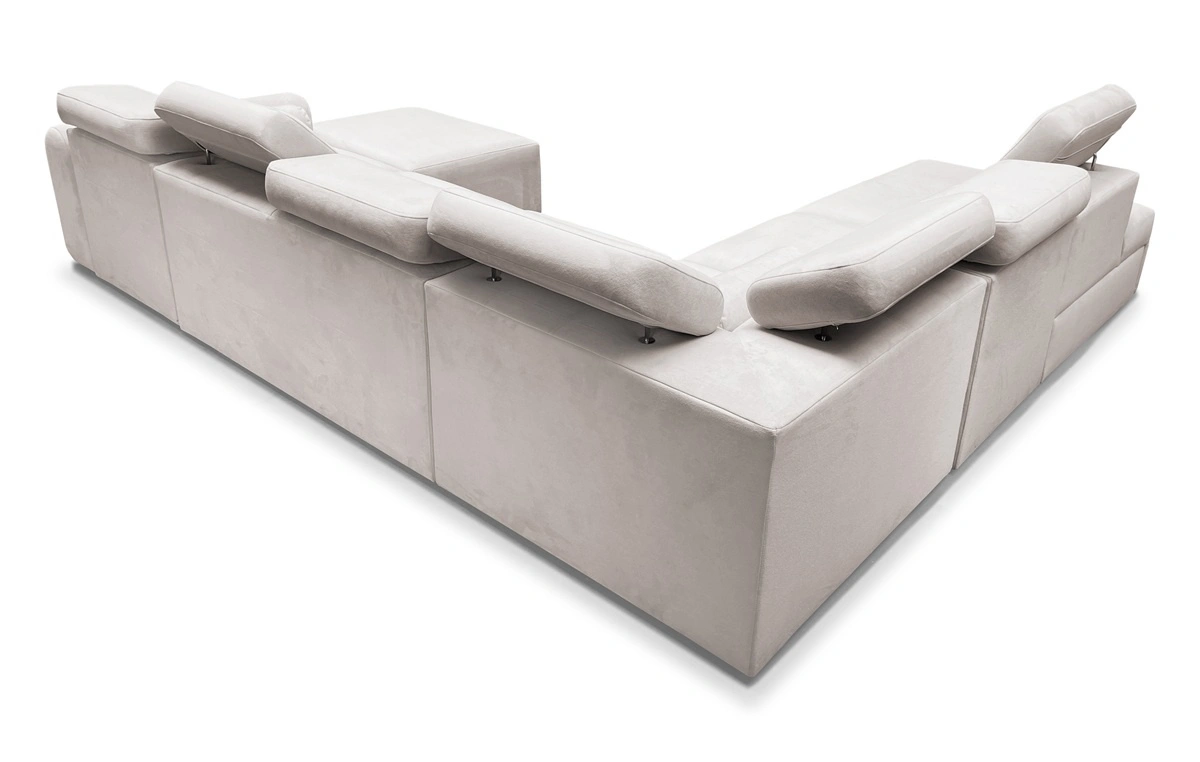 Wymiary mebla pozwolą na zapełnienie przestrzeni w przestronnym salonie lub pokoju dziennym. Szerokość narożnika 343 cm, wysokość maksymalna 95 cm oraz głębokość 283 cm. Powierzchnia spania narożnika wynosi 132x268 cm. Wysokość siedziska mebla to 42 cm a maksymalna wysokość oparcia wynosi 56 cm. Sprężyny faliste oraz pianka poliuretanowa T30 to materiał, z którego wykonane zostało siedzisko narożnika. Oparcie z regulowanymi zagłówkami pozwoli na łatwe dostosowanie kąta nachylenia zagłówków do swoich preferencji oraz daje gwarancję wygodnego wypoczynku po długim dniu, które docenisz Ty, Twoi bliscy a także goście, którzy zasiądą na tym wyjątkowym narożniku.