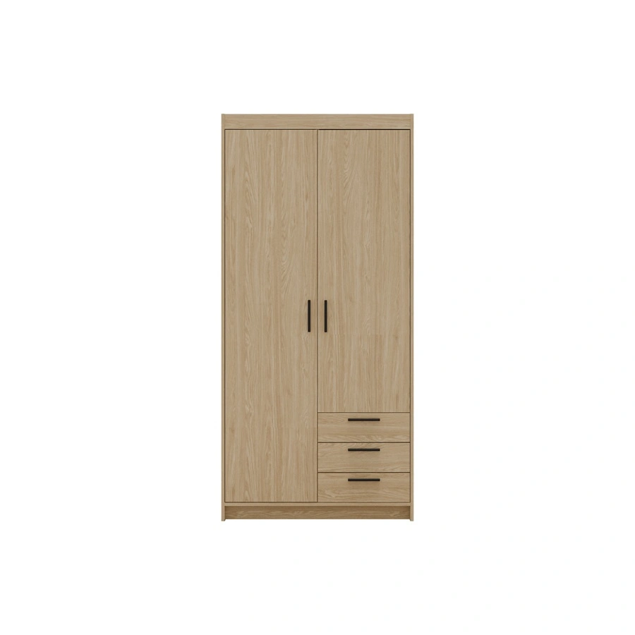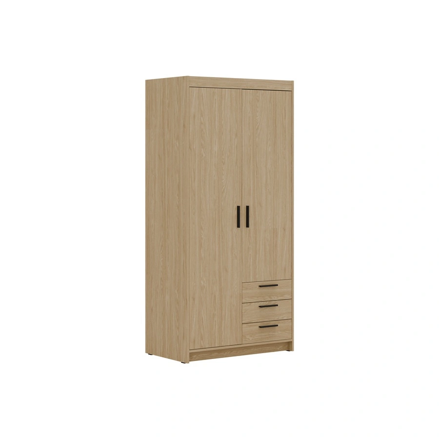 Szafa jest skonstruowana z 2 drzwi oraz 3 szuflad. Szafa gwarantuje komfortowe i bezproblemowe korzystanie oraz trwałość całego mebla przez wiele lat użytkowania. Połączenie dębu w naturalnym odcieniu z czarnymi uchwytami sprawia, że szafa na ubrania z powodzeniem sprawdzi się jako szafa do sypialni, jako szafa do przedpokoju lub szafa do pokoju dziecięcego. Szafy modułowe Rene będą również świetnym wyborem do pokoju niemowlęcego. Doskonale sprawdzi się także w roli garderoby do przedpokoju.