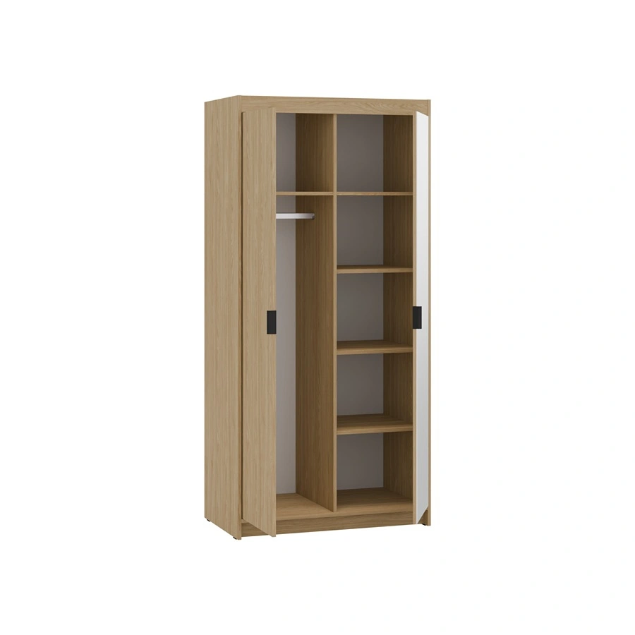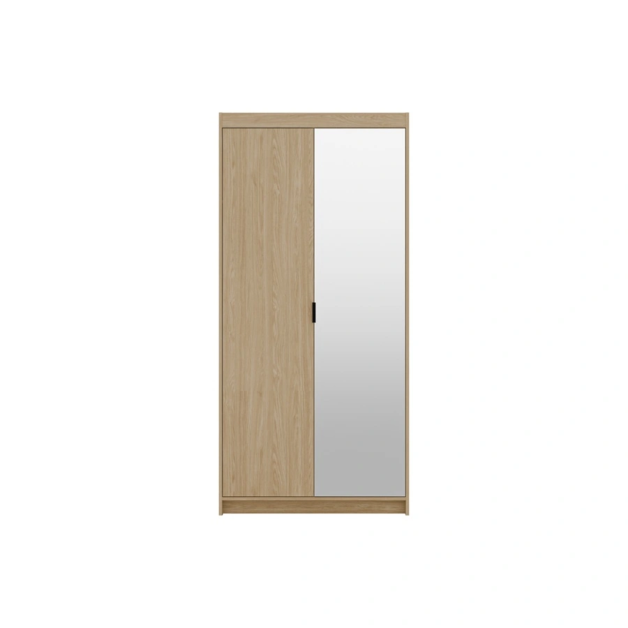 Szafa jest skonstruowana z 2 drzwi uchylnych. Szafa gwarantuje komfortowe i bezproblemowe korzystanie oraz trwałość całego mebla przez wiele lat użytkowania. Połączenie dębu w naturalnym odcieniu z czarnymi uchwytami sprawia, że szafa na ubrania z powodzeniem sprawdzi się jako szafa do sypialni, jako szafa do przedpokoju lub szafa do pokoju dziecięcego. Szafy z lustrem Rene będą również świetnym wyborem do pokoju niemowlęcego. Doskonale sprawdzi się także w roli garderoby do przedpokoju.