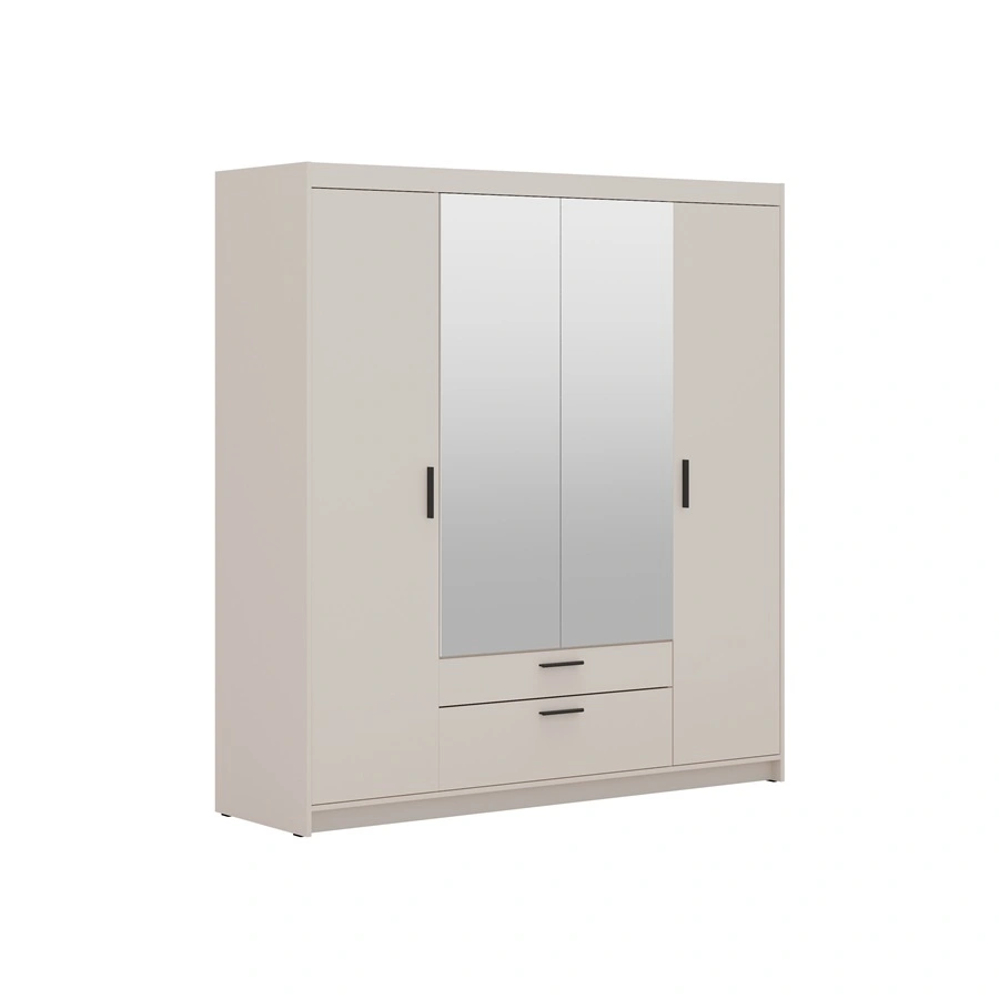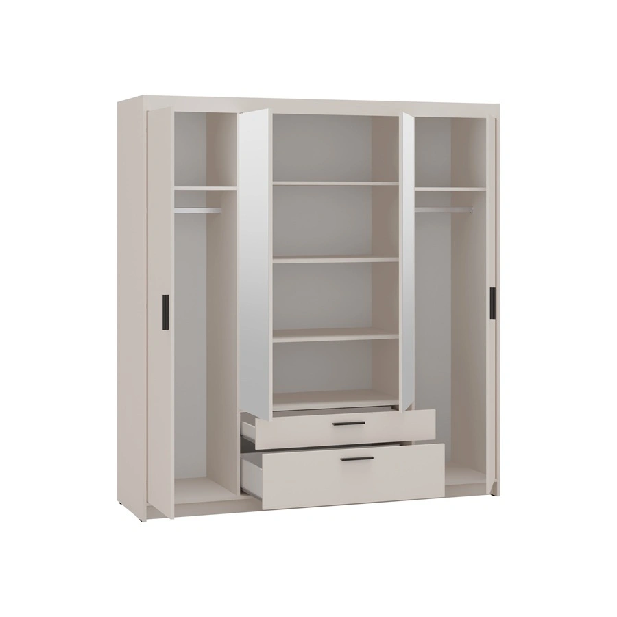 Szafa jest skonstruowana z 4 drzwi oraz 2 szuflad. Szafa gwarantuje komfortowe i bezproblemowe korzystanie oraz trwałość całego mebla przez wiele lat użytkowania. Połączenie beżu w piaskowym odcieniu z czarnymi uchwytami sprawia, że szafa na ubrania z powodzeniem sprawdzi się jako szafa do sypialni, jako szafa do przedpokoju lub szafa do pokoju dziecięcego. Szafy z lustrem Rene będą również świetnym wyborem do pokoju niemowlęcego. Doskonale sprawdzi się także w roli garderoby do przedpokoju.