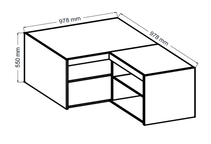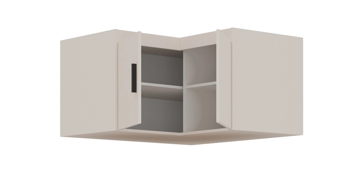 Nadstawka szafy narożnej posiada drzwi uchylne o wykończeniu matowym. Mebel skonstruowany jest z 2 drzwi. Nadstawka wykonana została z wysokiej jakości płyty laminowanej, która charakteryzuje się wysoką odpornością na wpływ czynników zewnętrznych takich jak obicia, uderzenia i niefortunne zadrapania. Dopełnieniem frontów nadstawki do szafy są czarne uchwyty, które podkreślą elegancję mebla. Wymiary mebla są optymalne. Szerokość 98x98 cm, wysokość 55 cm oraz głębokość 53 cm.
