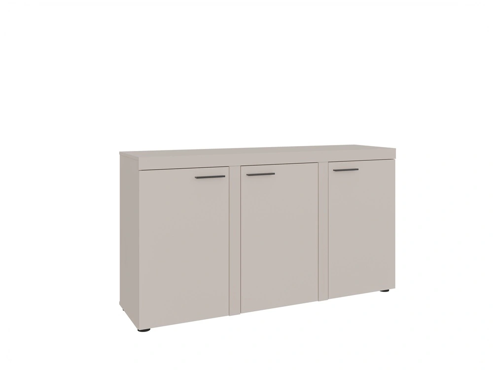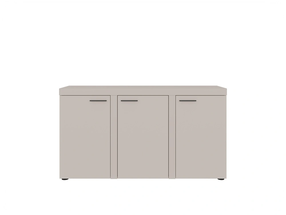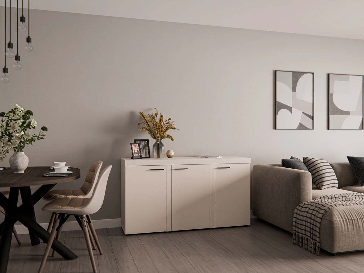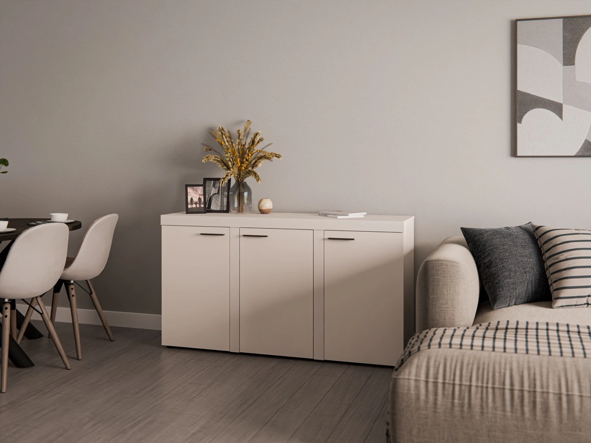 Komoda jest skonstruowana z 3 drzwi. Komoda gwarantuje komfortowe i bezproblemowe korzystanie oraz trwałość całego mebla przez wiele lat użytkowania. Połączenie beżu w piaskowym odcieniu z czarnymi uchwytami nada pomieszczeniu lekkości i przytulnego klimatu, dzięki czemu komoda Rene świetnie sprawdzi się w roli komody do salonu o oryginalnym wykończeniu, komody do pokoju dziennego lub komody do sypialni w nowoczesnym stylu. Komoda Rene z powodzeniem odnajdzie się także jako mebel biurowy.