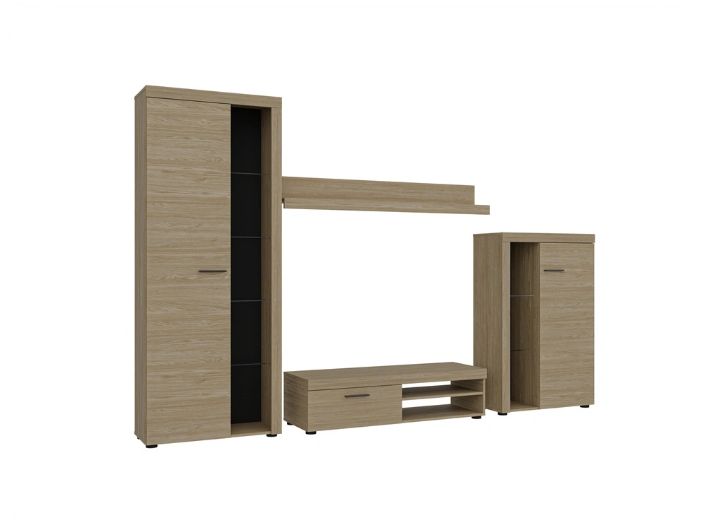 Meblościanka Rene została zaprojektowana w sposób funkcjonalny i użytkowy, oferując dużo miejsca do przechowywania. Połączenie dębu w naturalnym odcieniu z czarnymi uchwytami świetnie łączy się z innymi kolorami, dzięki czemu meble Rene świetnie sprawdzą się jako meblościanka do salonu lub meblościanka do pokoju dziennego.
