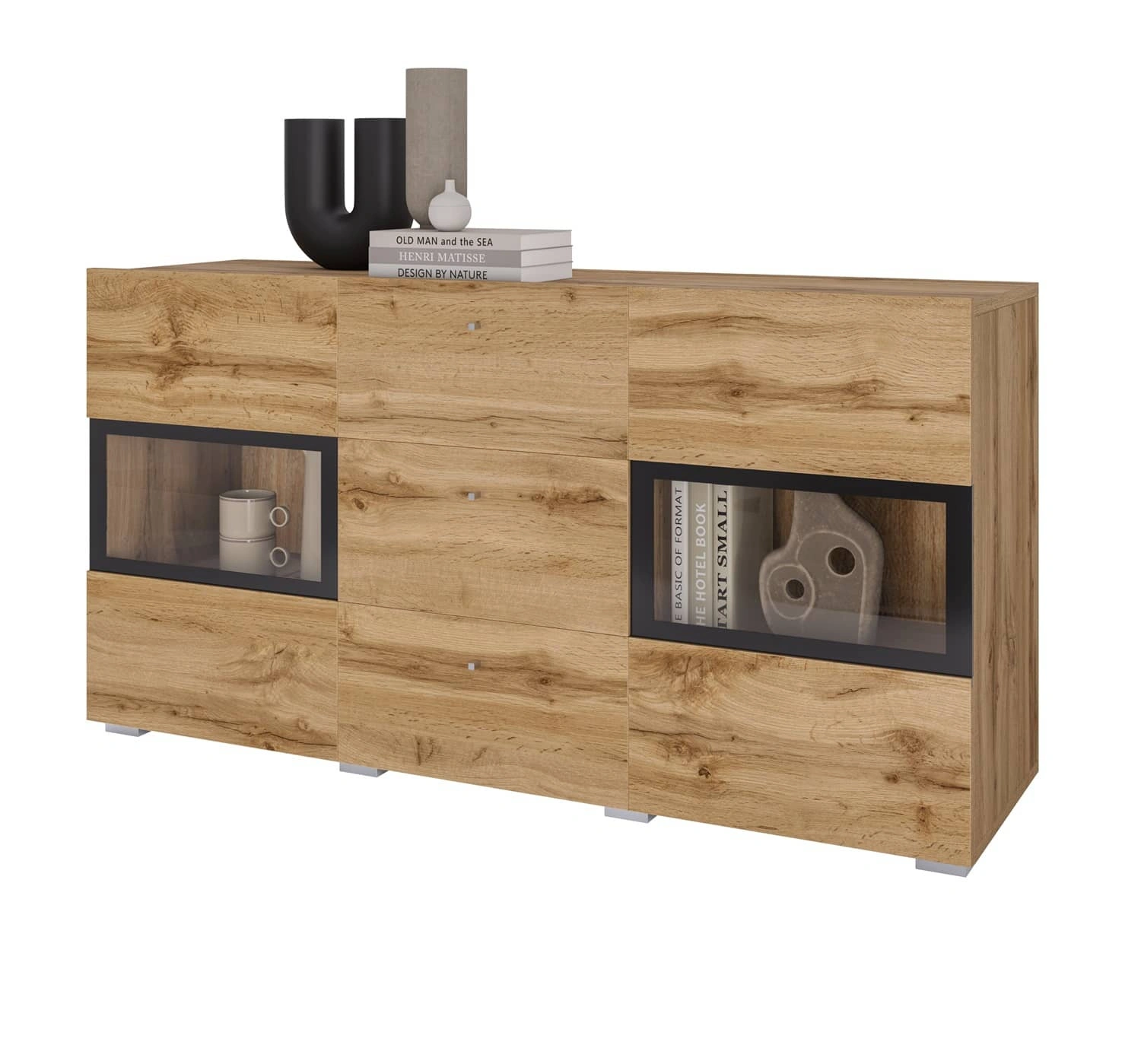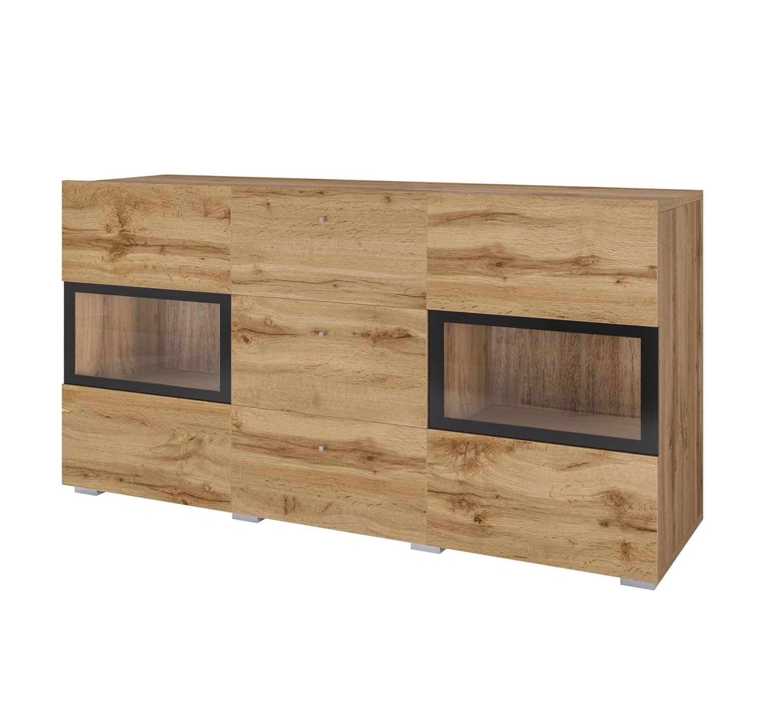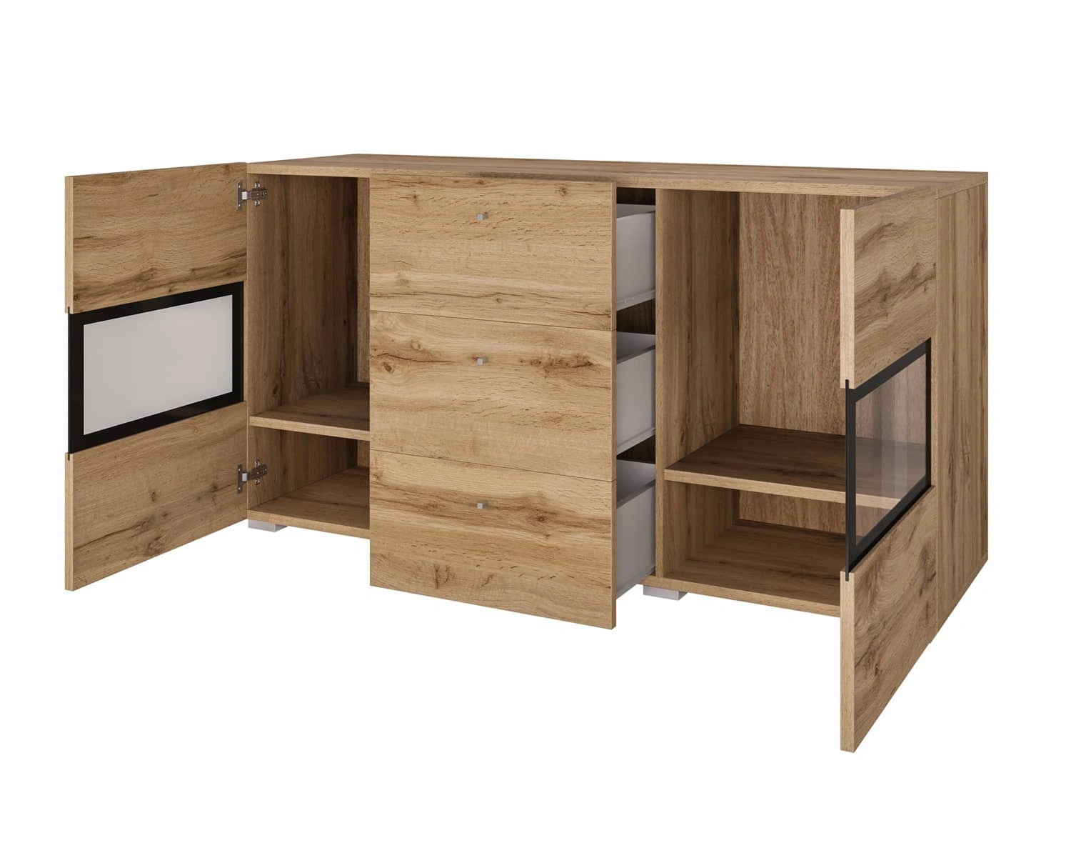 Nowoczesna komoda do salonu wykonana została z wysokiej jakości płyty laminowanej o grubości 15mm, która charakteryzuje się odpornością na wpływ czynników zewnętrznych takich jak obicia, uderzenia i niefortunne zadrapani. Pojemne szuflady oraz zamykane szafki komody pomieszczą wszystkie rzeczy oraz niezbędne akcesoria. Przeszklony front komody pozwoli wyeksponować dodatki stanowiące dekorację salonu.