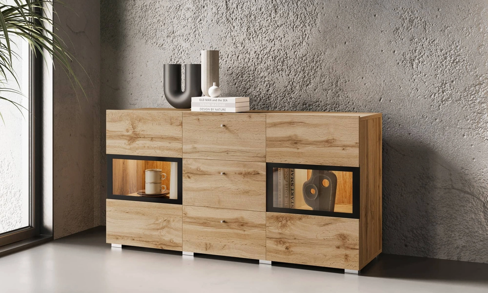 Komoda z szufladami Baros to mebel o minimalistycznej formie oraz oryginalnym wykończeniu. Prosta bryła tworzona na wzór geometrii stworzy harmonijne i niepowtarzalne wnętrze. Ciepły dąb wotan znakomicie współgra z wstawkami w kolorze czarnym nadając meblom nowoczesnego wyglądu i kontrastu. Takie zestawienie kolorystyczne doskonale oddaje unikatowy charakter komody. Komoda z szufladami Baros stworzy oryginalną i niebanalną dekorację