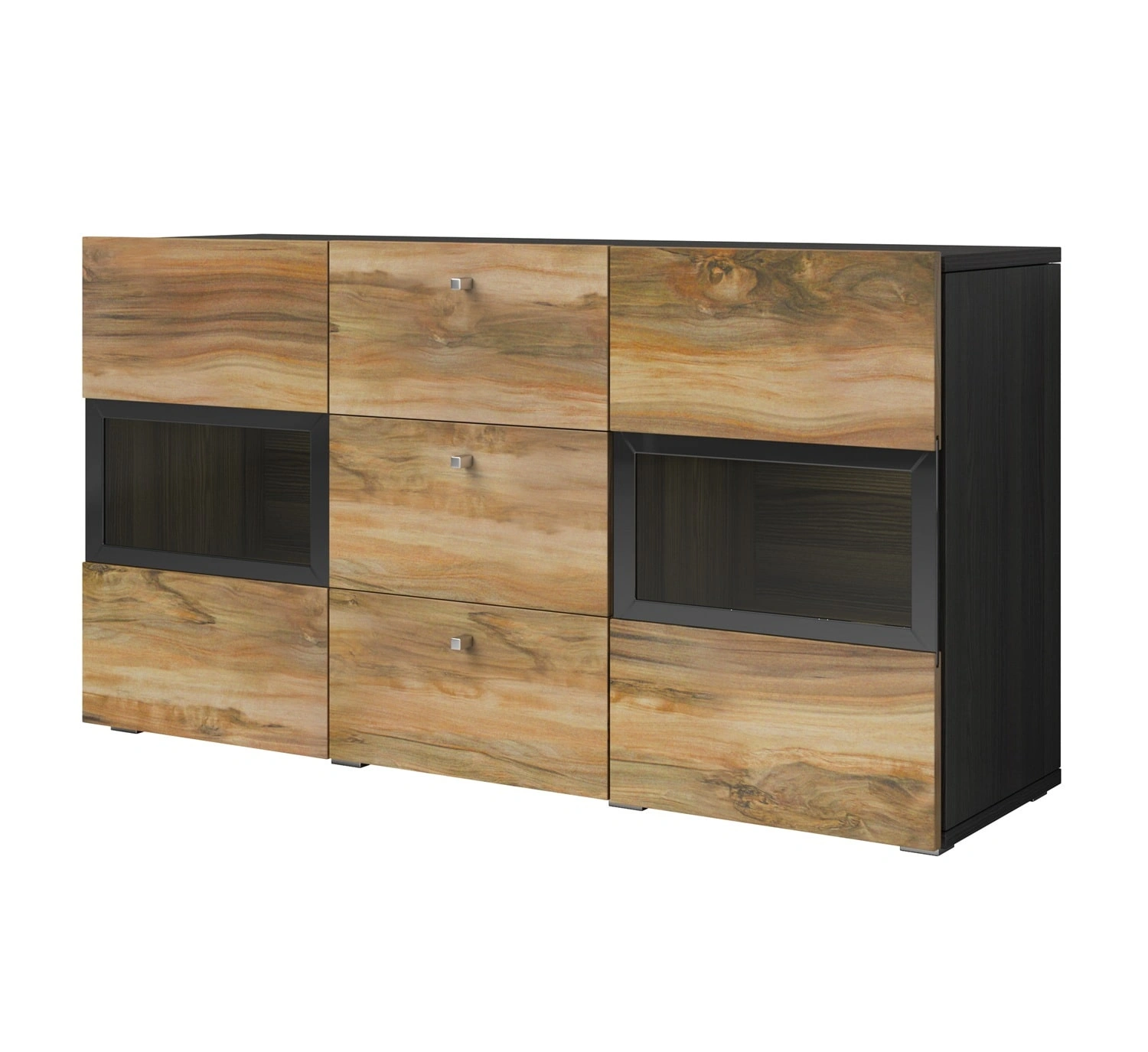 Nowoczesna komoda do salonu wykonana została z wysokiej jakości płyty laminowanej o grubości 15mm, która charakteryzuje się odpornością na wpływ czynników zewnętrznych takich jak obicia, uderzenia i niefortunne zadrapani. Pojemne szuflady oraz zamykane szafki komody pomieszczą wszystkie rzeczy oraz niezbędne akcesoria. Przeszklony front komody pozwoli wyeksponować dodatki stanowiące dekorację salonu.