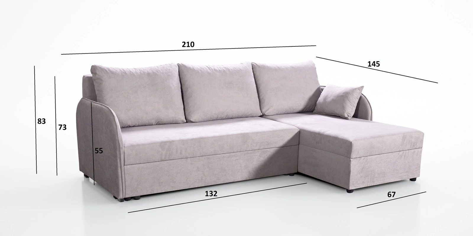Dzięki swoim wymiarom oraz szerokiej funkcjonalności narożnik z funkcją spania świetnie sprawdzi się jako narożnik do pokoju dziennego lub jako narożnik rozkładany do pokoju gościnnego. Narożnik z funkcja spania to także świetna alternatywa łóżka w pokoju młodzieżowym. Szerokość narożnika 210 cm, wysokość 83 cm oraz głębokość 145 cm. Powierzchnia spania narożnika wynosi 123x200 cm. Wysokość siedziska mebla to 40 cm, a wysokość oparcia wynosi 43 cm. Pianka poliuretanowa T28 to materiał, z którego wykonane zostało siedzisko narożnika. Miękkie poduchy oparciowe zapewnią wysoki komfort podczas codziennego odpoczynku, który docenisz Ty a także goście, którzy zasiądą na tym wyjątkowym narożniku.