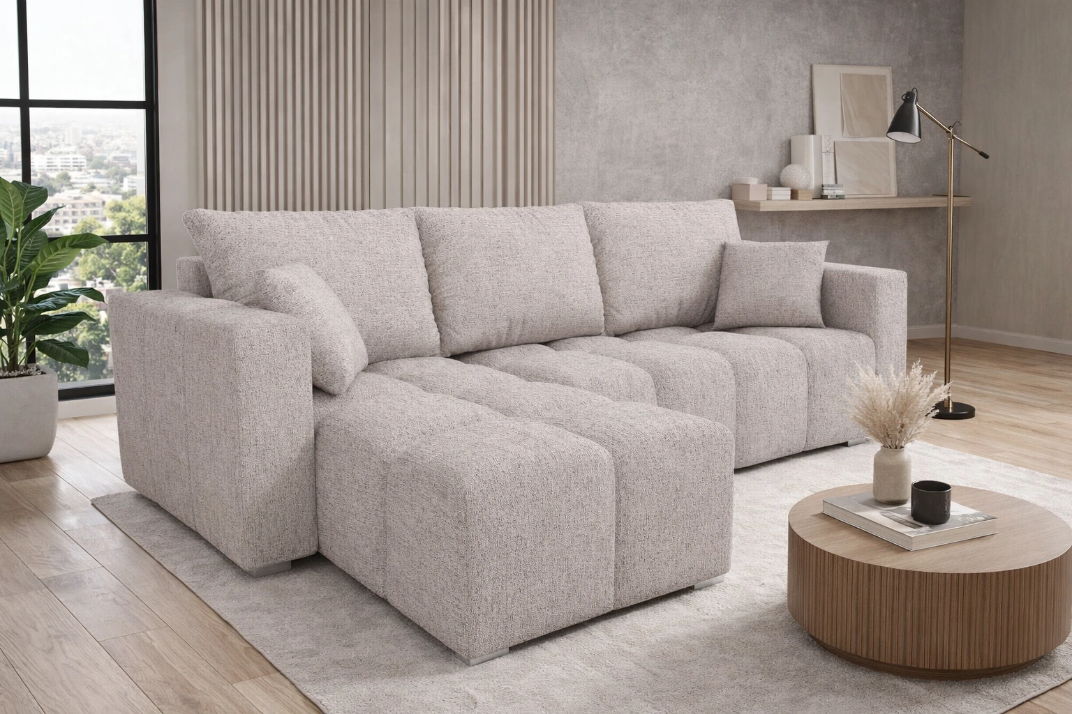 Narożnik z funkcją spania Linco beżowy uniwersalny narożnik o nowoczesnym designie wykonany z wytrzymałej plecionej tkaniny