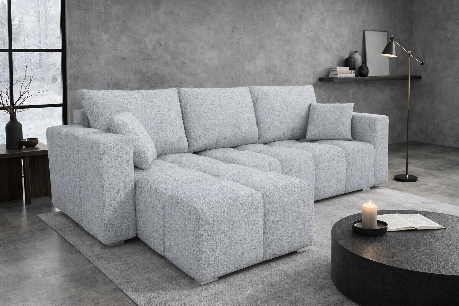 Narożnik z funkcją spania Linco szary popiel uniwersalny narożnik o nowoczesnym designie wykonany z wytrzymałej plecionej tkaniny
