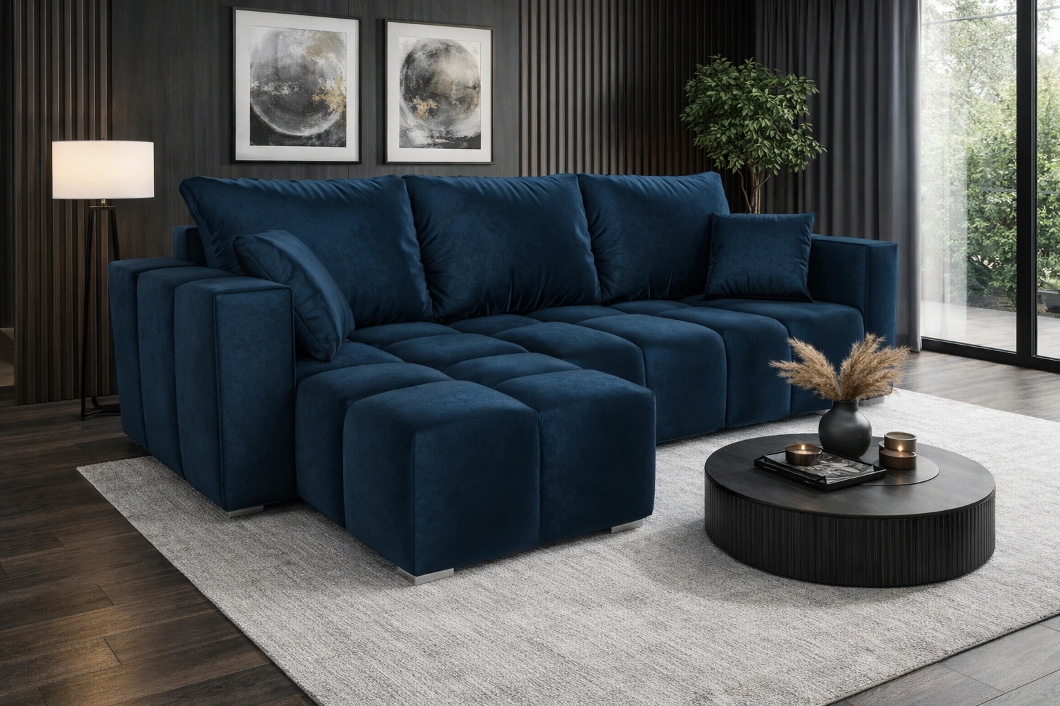 Narożnik z funkcją spania Linco granatowy uniwersalny narożnik o nowoczesnym designie wykonany z miękkiej tkaniny typu velvet