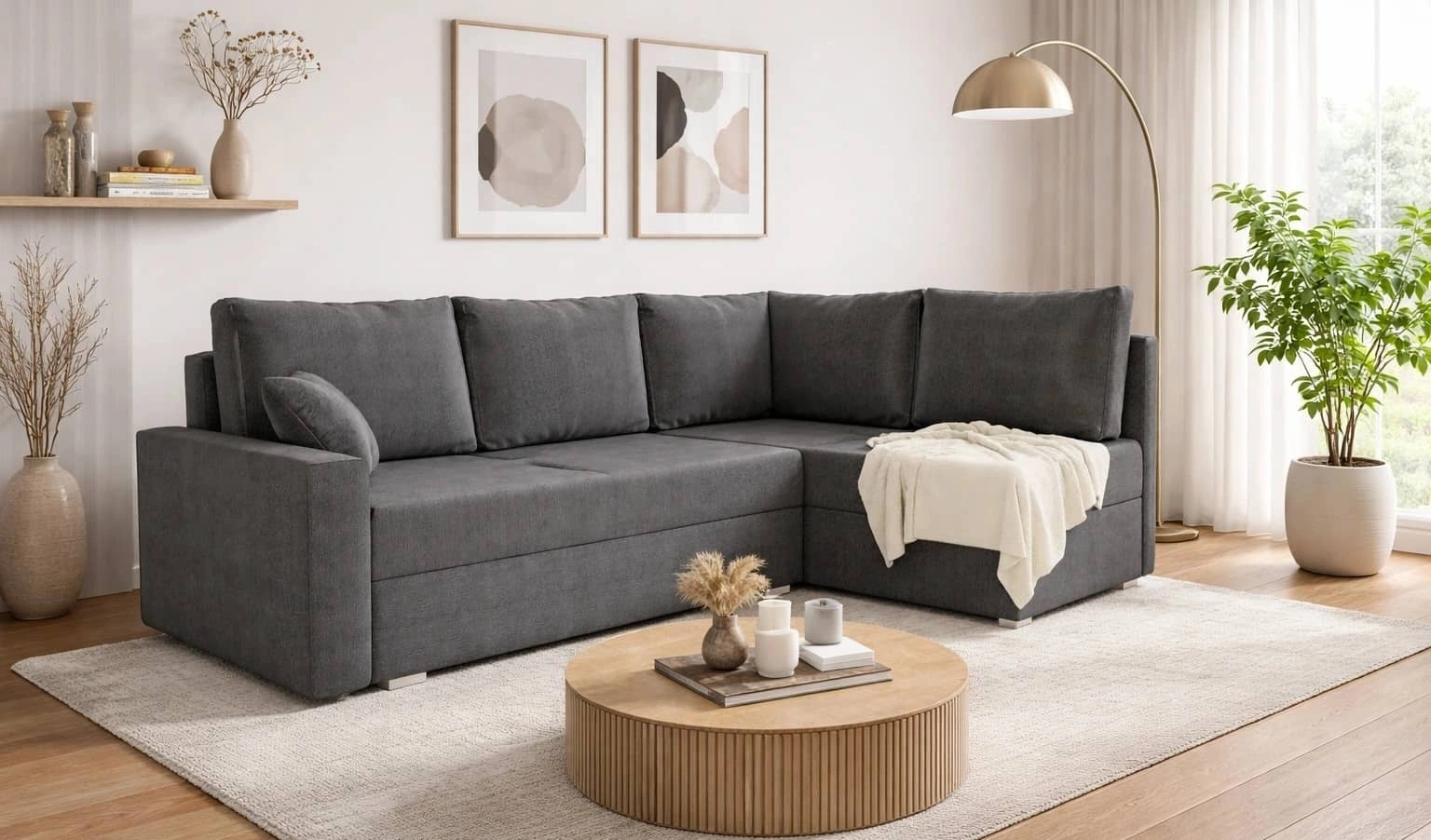 Narożnik z funkcją spania Nofi ciemny szary prawostronny nowoczesny design prosta i stylowa bryła wpisująca się w każdą aranżację