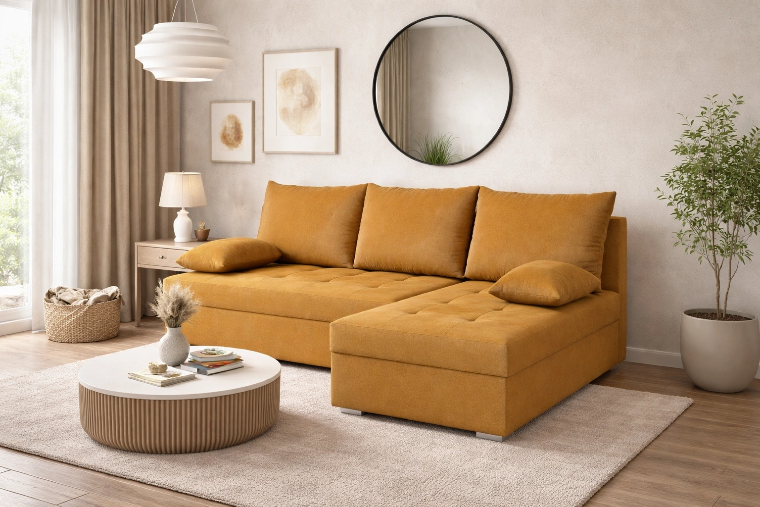 Narożnik z funkcją spania Fasti musztardowy uniwersalny w ustawieniu narożnik z pojemnikiem na pościel gwarancja najwyższego komfortu