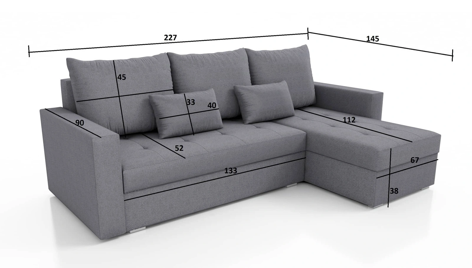 Dzięki swoim optymalnym wymiarom oraz szerokiej funkcjonalności narożnik z funkcją spania świetnie sprawdzi się jako narożnik do pokoju dziennego lub jako narożnik rozkładany do pokoju nastolatka. Szerokość narożnika 227 cm, wysokość maksymalna 85 cm oraz głębokość 145 cm. Powierzchnia spania narożnika wynosi 122x199 cm. Wysokość siedziska mebla to 38 cm a maksymalna wysokość oparcia wynosi 45 cm. Pianka poliuretanowa T28 to materiały, z którego wykonane zostało siedzisko narożnika. Oparcie z luźnymi poduchami daje gwarancję wygodnego wypoczynku po długim dniu, które docenisz Ty, Twoi bliscy a także goście, którzy zasiądą na tym wyjątkowym narożniku.