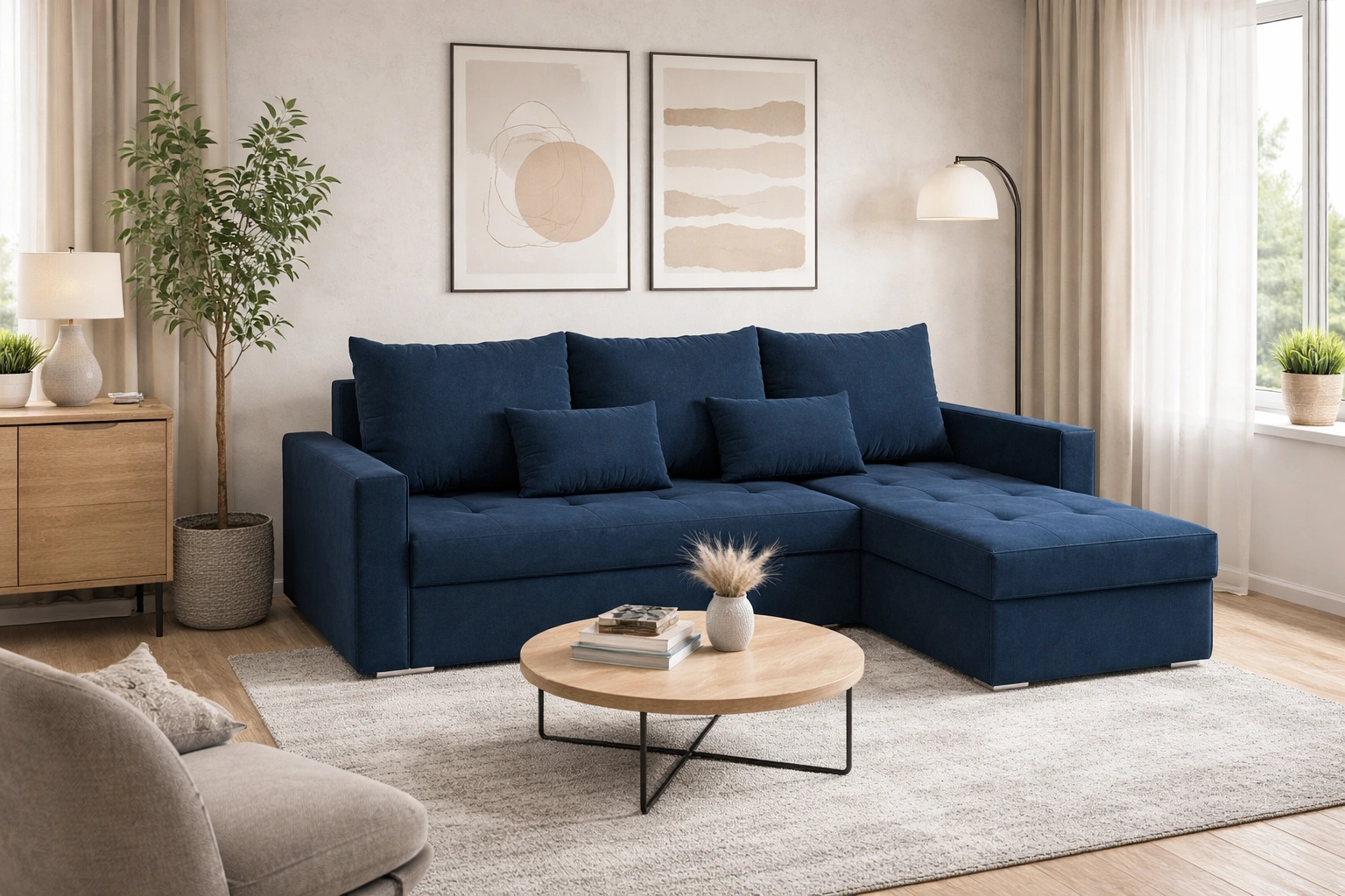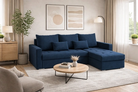 Narożnik z funkcją spania Fasti Bis granatowy uniwersalny narożnik z pojemnikiem na pościel gwarancja najwyższego komfortu