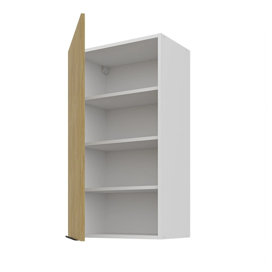 Trzy półki szafki kuchennej można wyciągnąć i uzyskać miejsce na wysokie przedmioty. Drzwi są uniwersalne i można je zamontować po prawej lub po lewej stronie. Standardowym wyposażeniem szafki kuchennej są zawiasy z systemem cichego domykania. Spowalniacze zwiększają komfort i bezpieczeństwo użytkowania mebli.