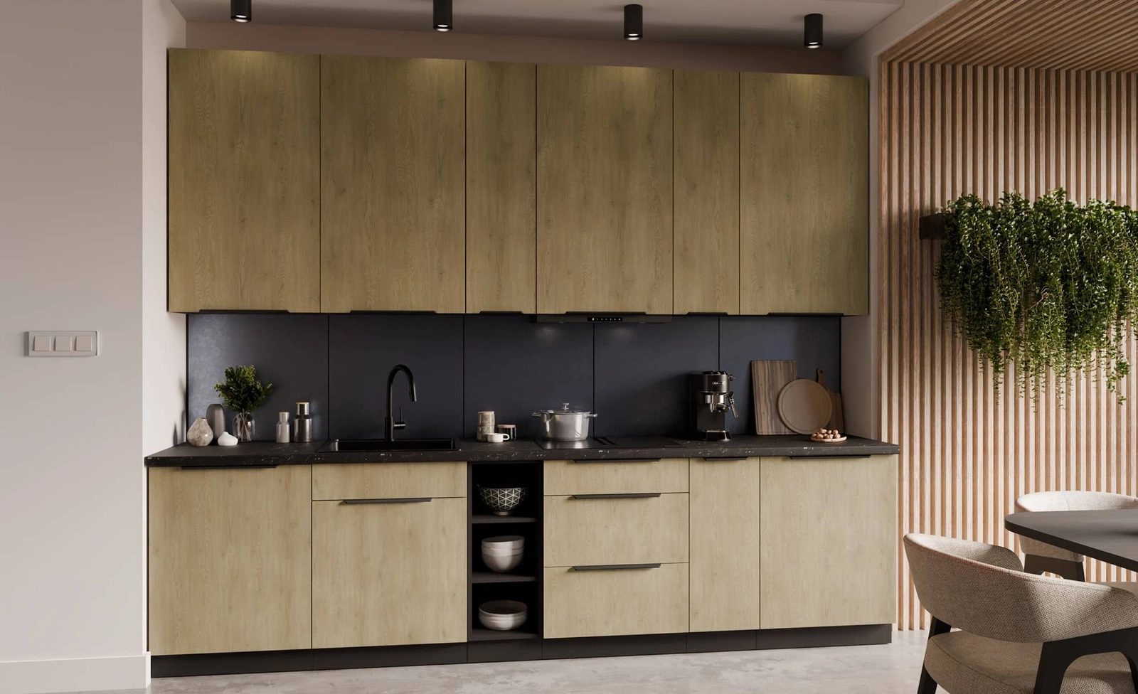 Szafka kuchenna z kolekcji Crotone została zaprojektowana z myślą o wszystkich, którzy cenią sobie estetykę oraz poszukują funkcjonalnych rozwiązań do swojej kuchni. Proste bryły, gładkie powierzchnie oraz eleganckie połączenie modnego dębu cremona z klasyczną czernią sprawia, że szafki kuchenne Crotone wpasują się we wnętrze w każdym stylu. Meble kuchenne Crotone charakteryzują się solidną jakością wykonania, a także użytkowym wzornictwem. Meble modułowe do kuchni to produkty wykonane w trosce o komfort podczas codziennego użytkowania i długoletni, elegancki wygląd.