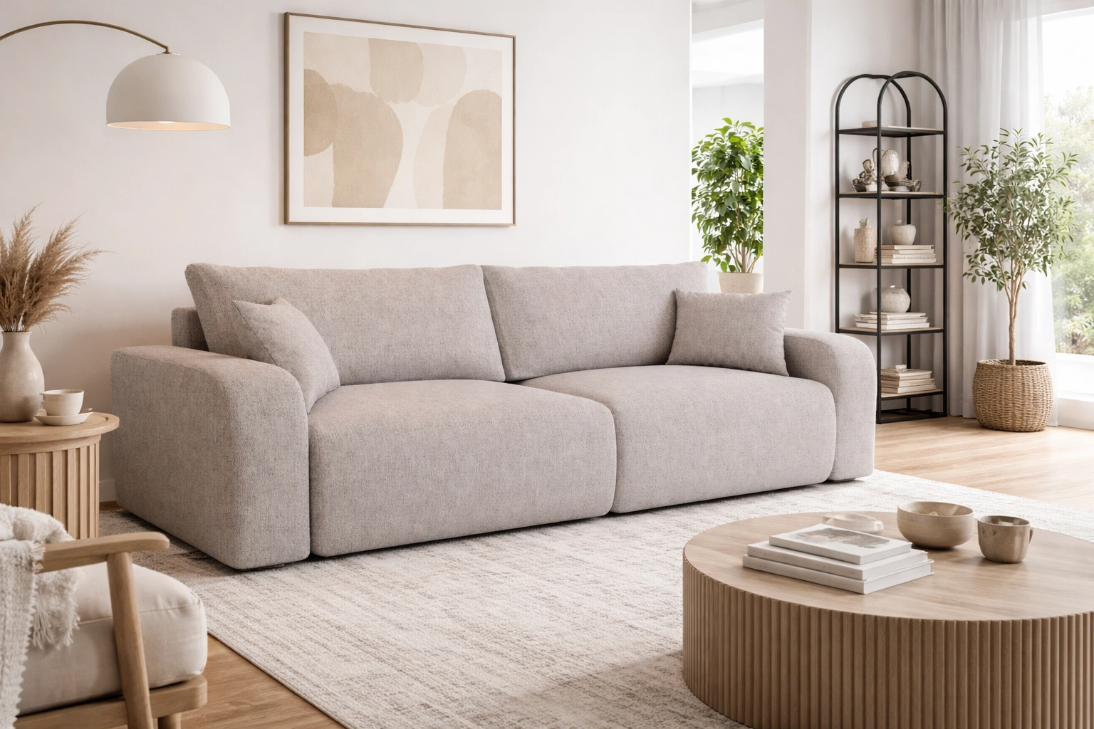 Kanapa rozkładana Fiesta beżowa funkcjonalna sofa do salonu z pojemnikiem na pościel elegancki wygląd wytrzymała pleciona tkanina