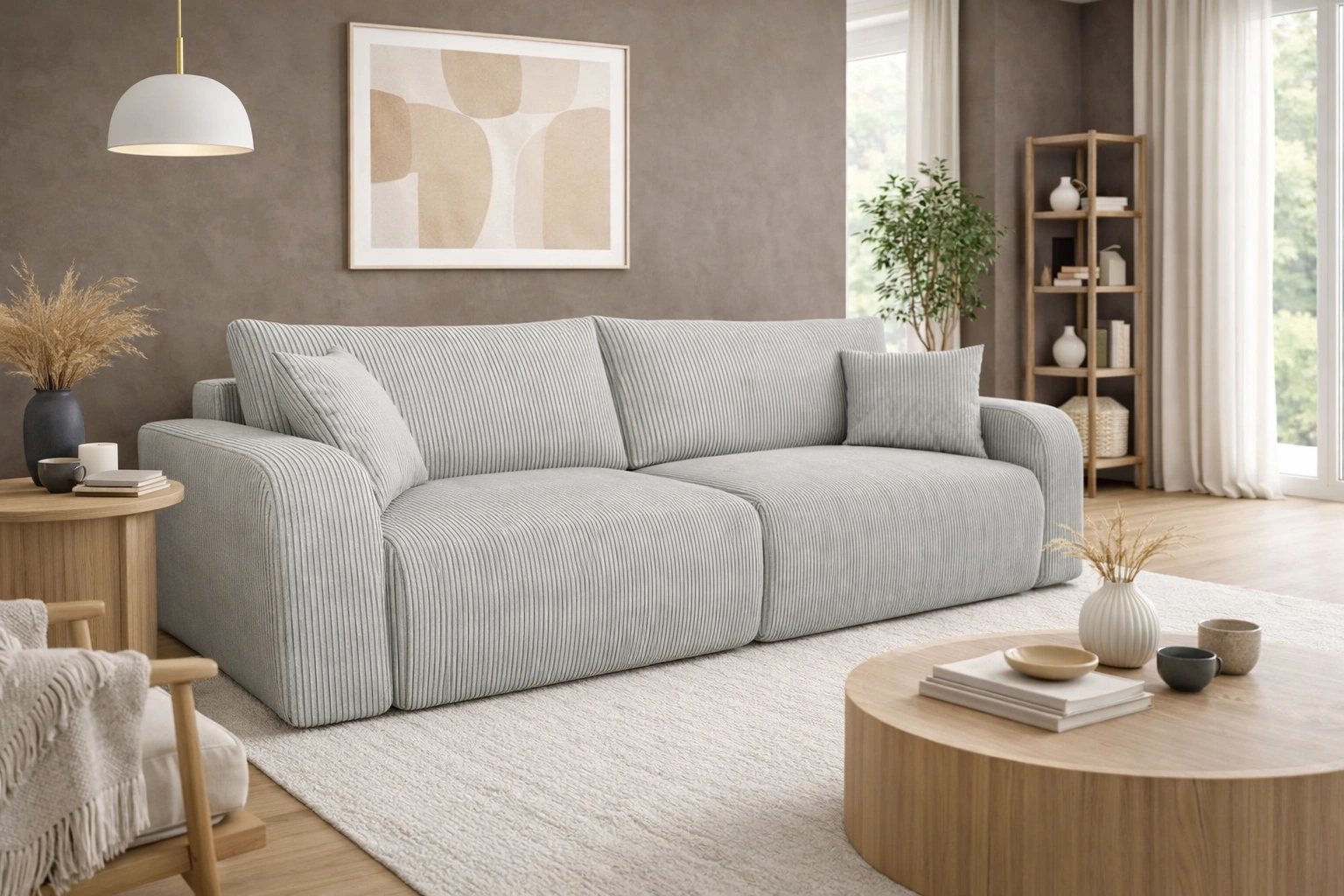 • Kanapa Fiesta charakteryzuje się wysoką elegancją i komfortem. Połączenie minimalistycznej konstrukcji z obłymi kształtami dodaje nietuzinkowego wyglądu. Dużym atutem bryły jest funkcja spania oraz miękka sztruksowa tkanina o wyrazistych prążkach.