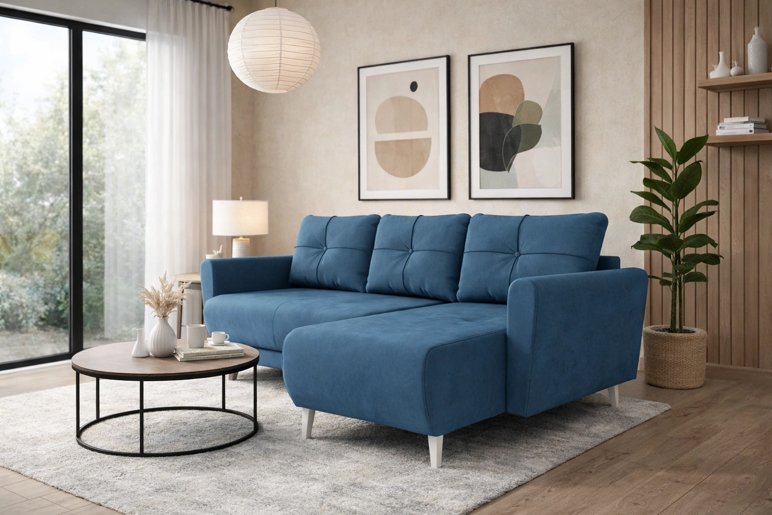 Narożnik z funkcją spania Felicie niebieski uniwersalny w ustawieniu narożnik stylowy design wpisujący się w każdą aranżację