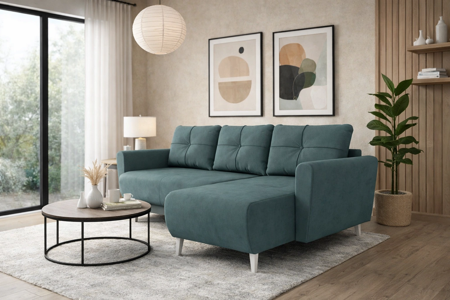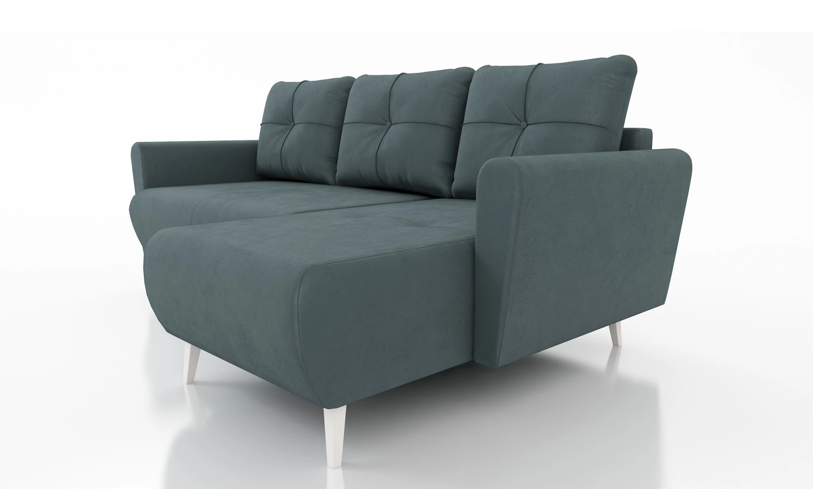 Narożnik z funkcją spania Felicie charakteryzuje się połączeniem stylu tradycyjnego oraz skandynawskiego. Konstrukcja narożnika w całości została pokryta tkaniną typu plusz Paros 06, gwarantując najwyższy komfort i funkcjonalność podczas codziennego wypoczynku w salonie, pokoju dziennym, pokoju gościnnym czy innym pomieszczeniu, w którym planujesz ustawić ten niezwykle nowoczesny narożnik. Stylowa bryła została wyposażona w zaoblone boczki i wysokie, smukłe nogi nadając wizualnej lekkości całej konstrukcji. Narożnik Felicie to mebel uniwersalny, co oznacza, że montaż szezlongu można dostosować do prawej lub lewej strony. Jest to idealne rozwiązanie dla osób lubiących aranżować wnętrza lub mających niestandardowe układy pomieszczeń.